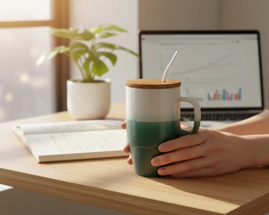 Designed by celebrated artist Deeksha Gupta for Leafbud, this ceramic travel mug is a fusion of natural teak, borosilicate glass, and long-lasting silicone. It comes in two beautiful glazes and is a one-of-a-kind masterpiece.