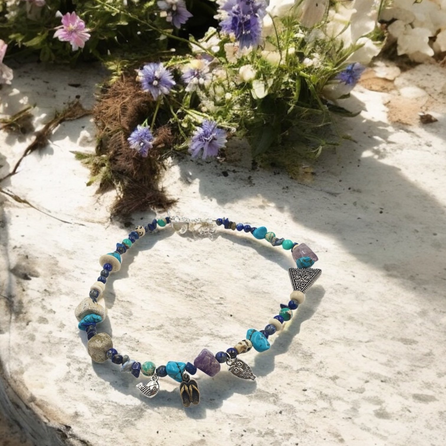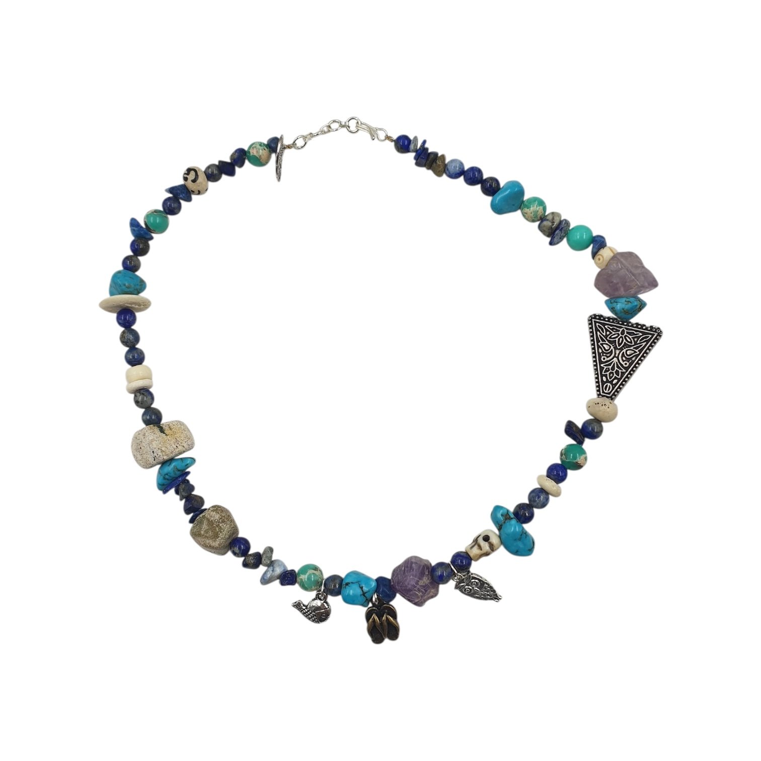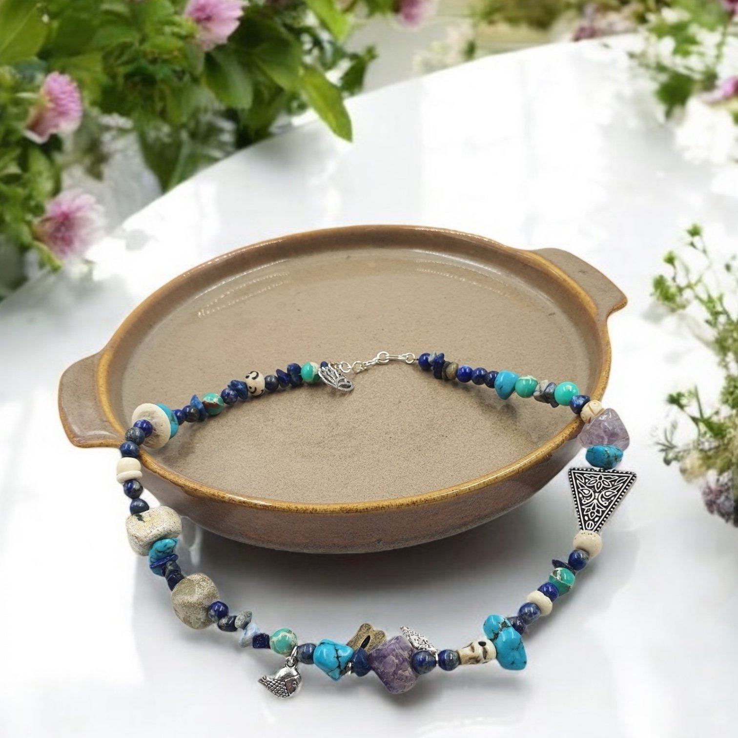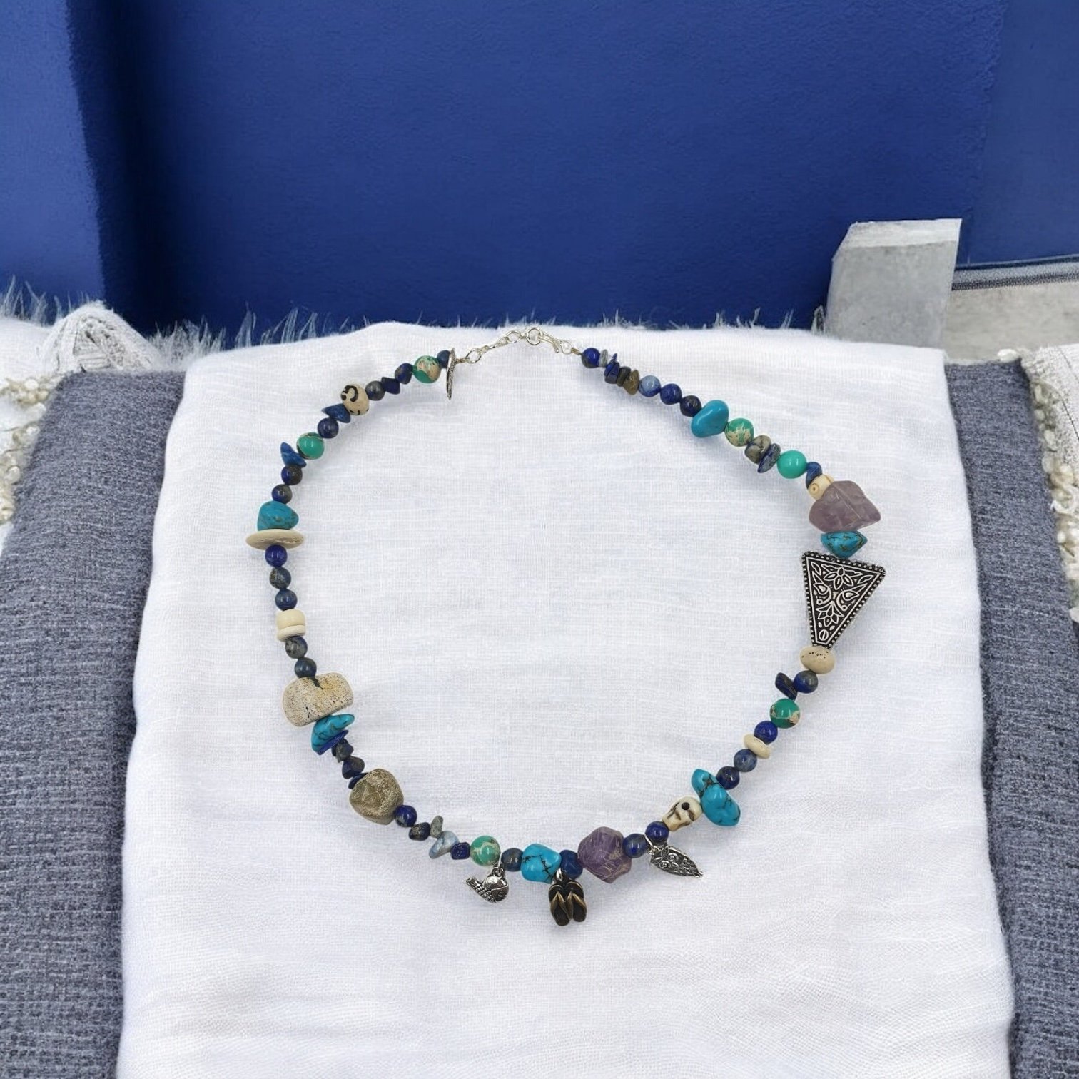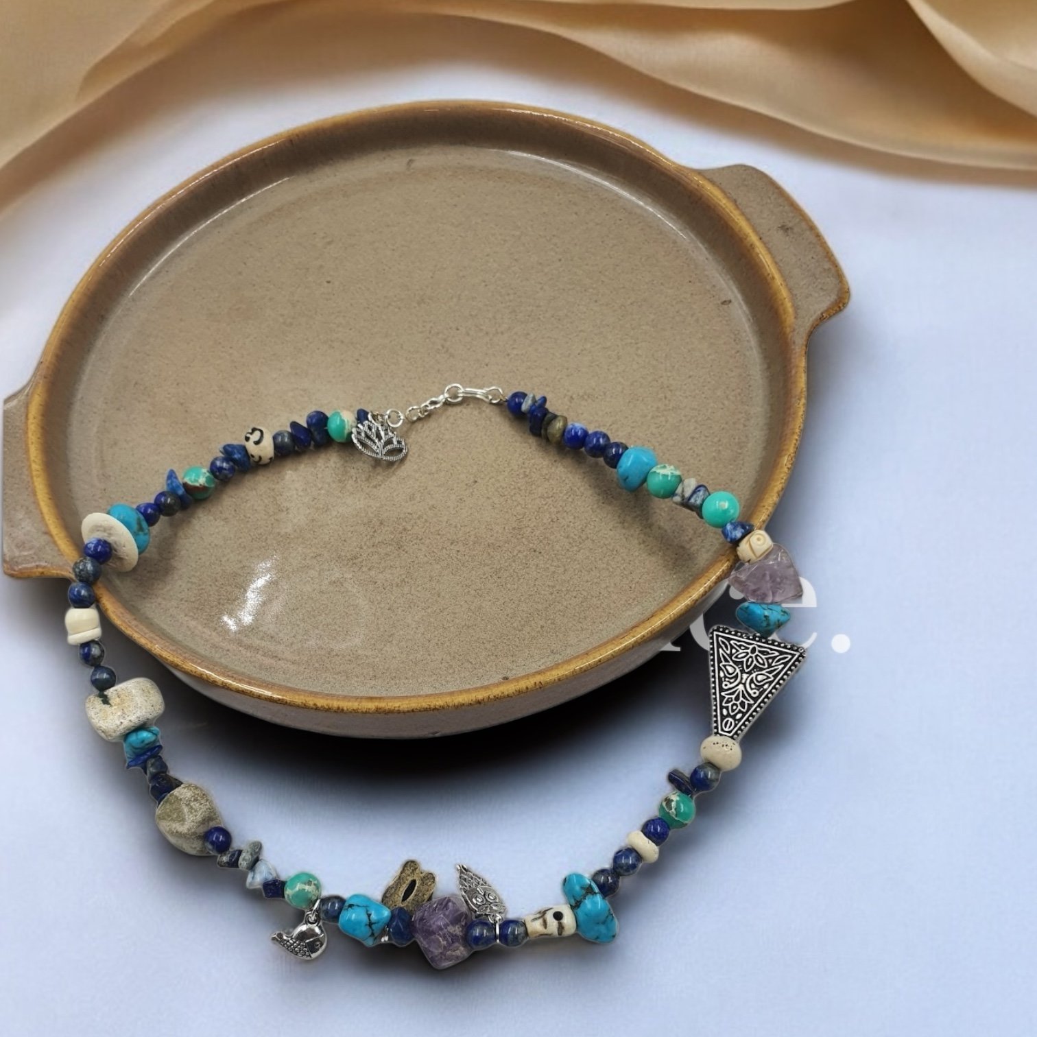 Turquoise, lapis, and agate converge in a triangular charm design. A boho-modern statement piece representing energy, intuition, and grounding—it’s bold, symbolic, and unapologetically crafted for spirits who thrive on meaningful self-expression.