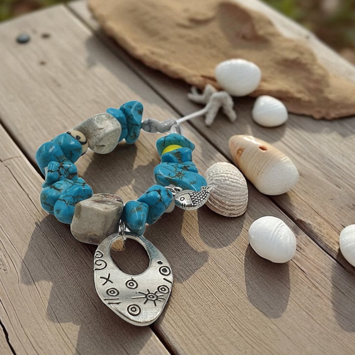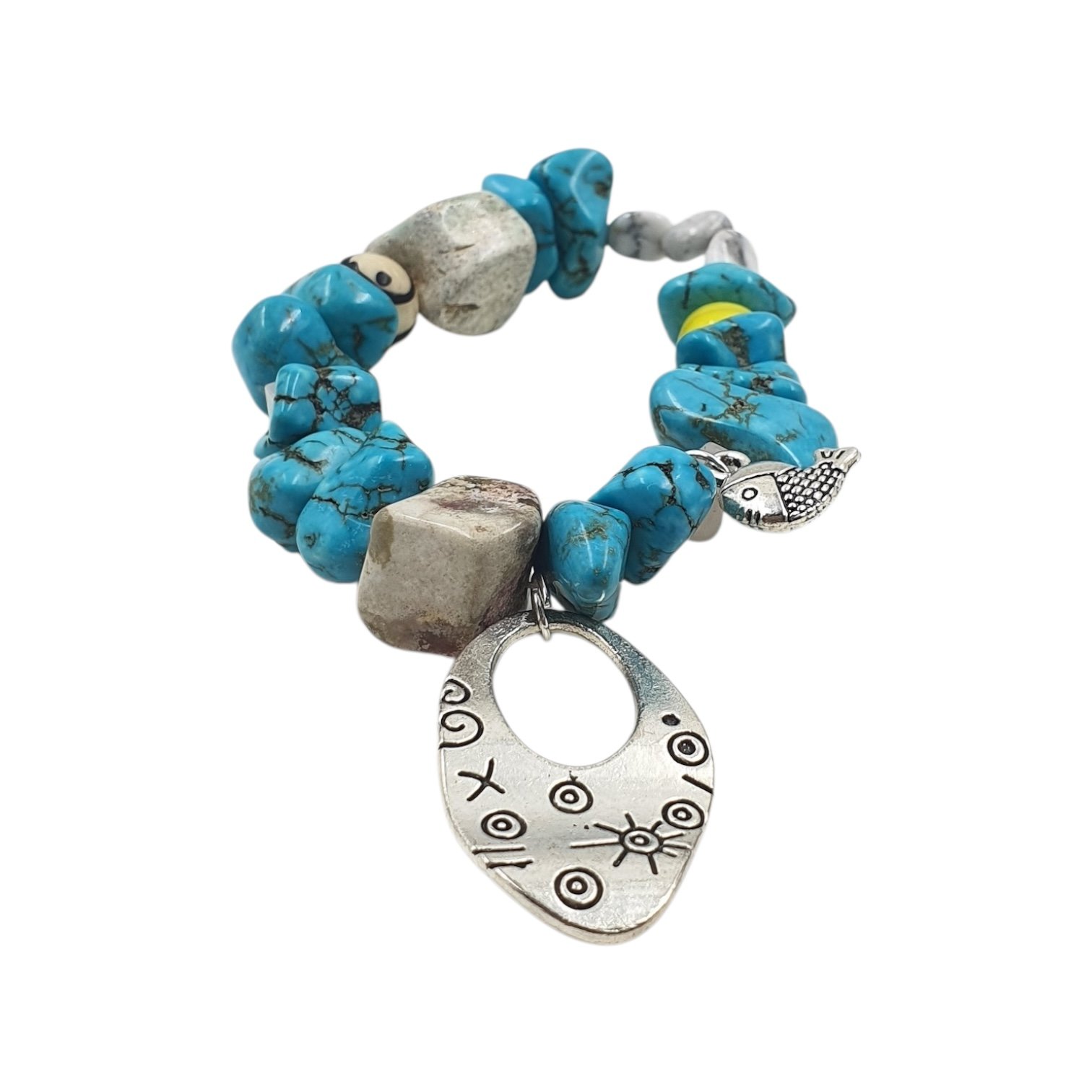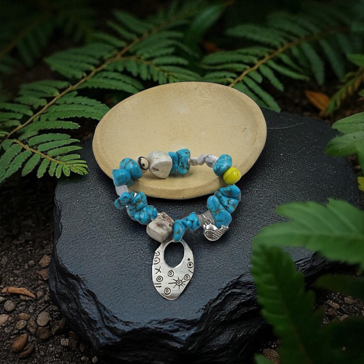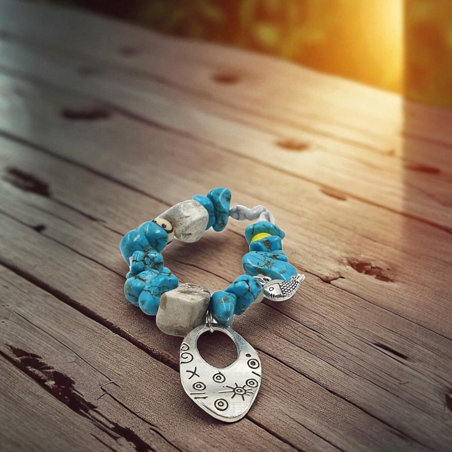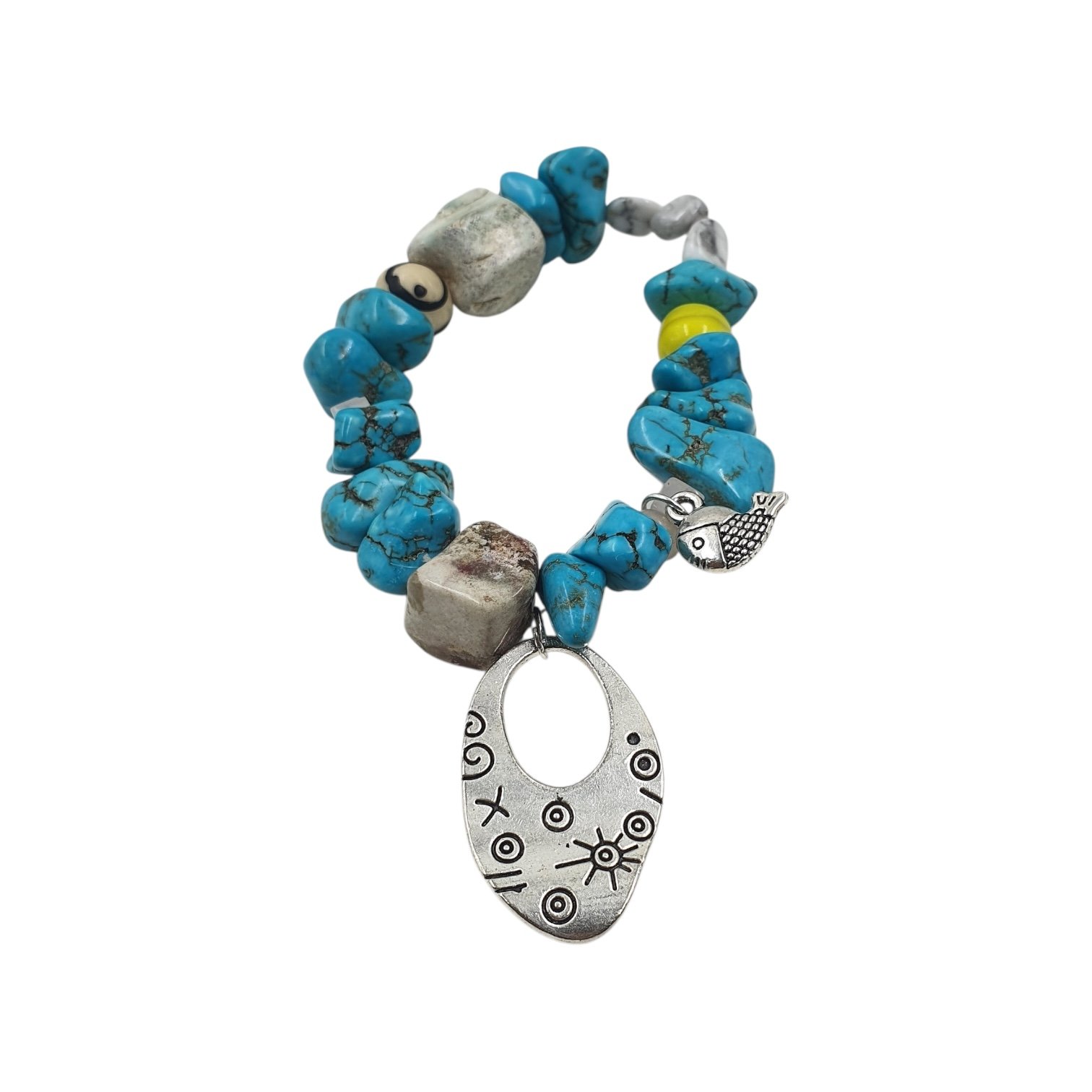 Uncut turquoise with a bold oval charm and yellow bead. Rugged yet radiant, this bracelet celebrates imperfection, individuality, and untamed artistry—crafted for those who walk freely between wildness and beauty.