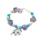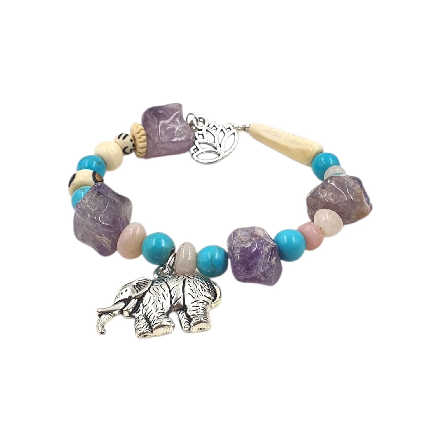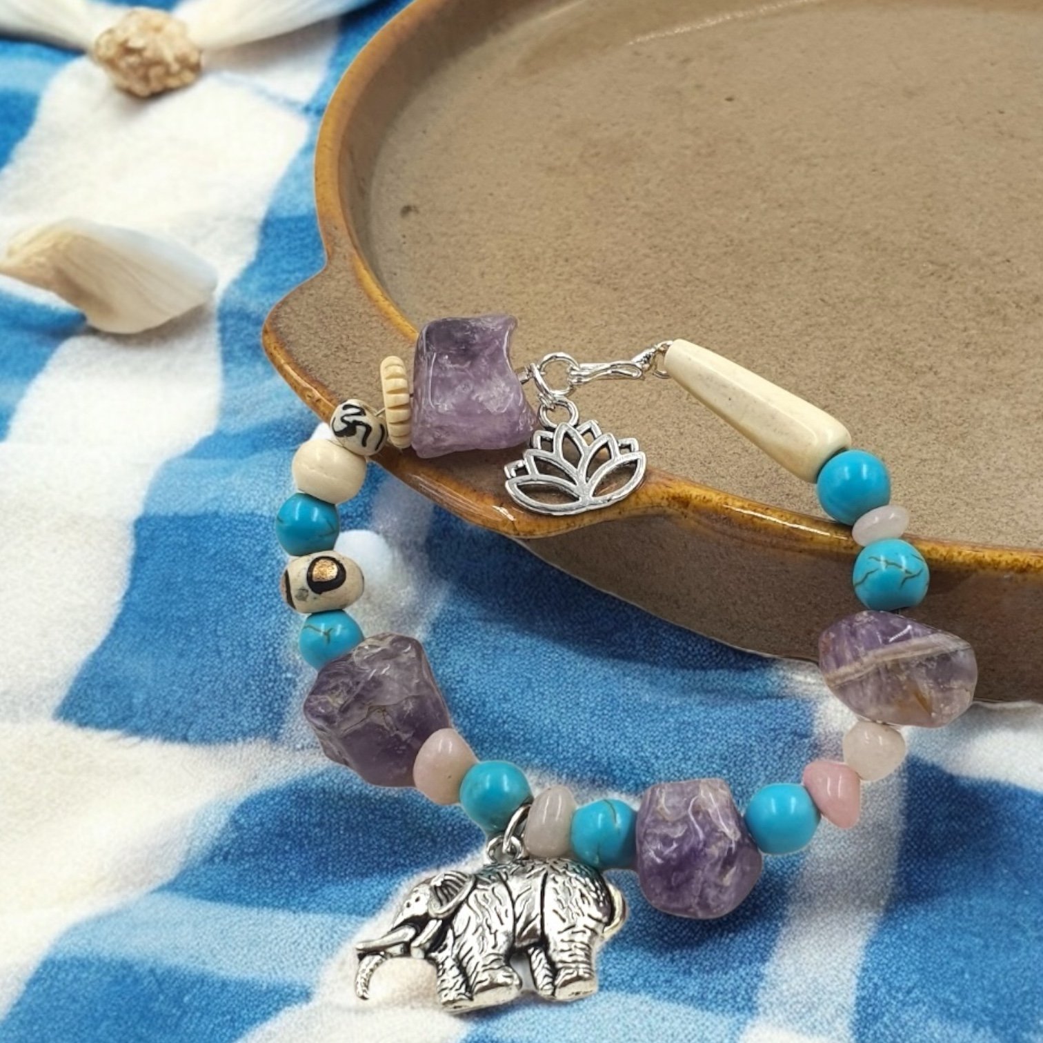 Turquoise, amethyst, and pink opal beads meet an elephant charm in this vibrant bracelet. A mix of calm strength and playful colour, it carries soulful energy—crafted for dreamers who embrace joy, stories, and soulful connection.