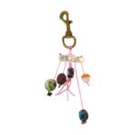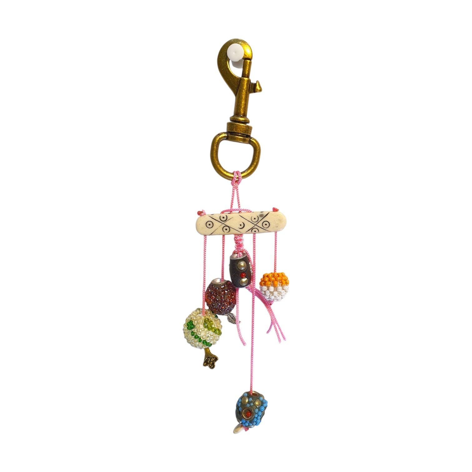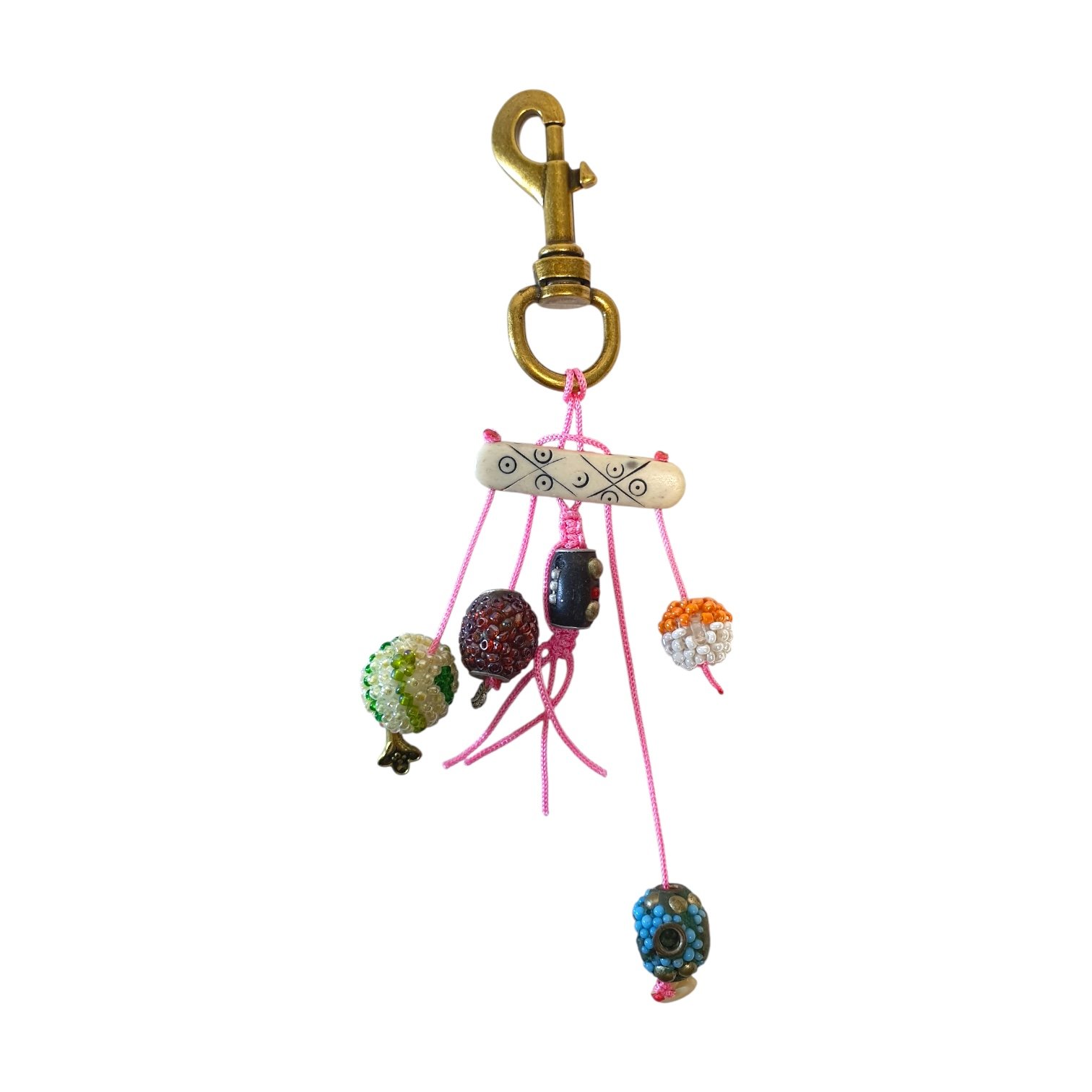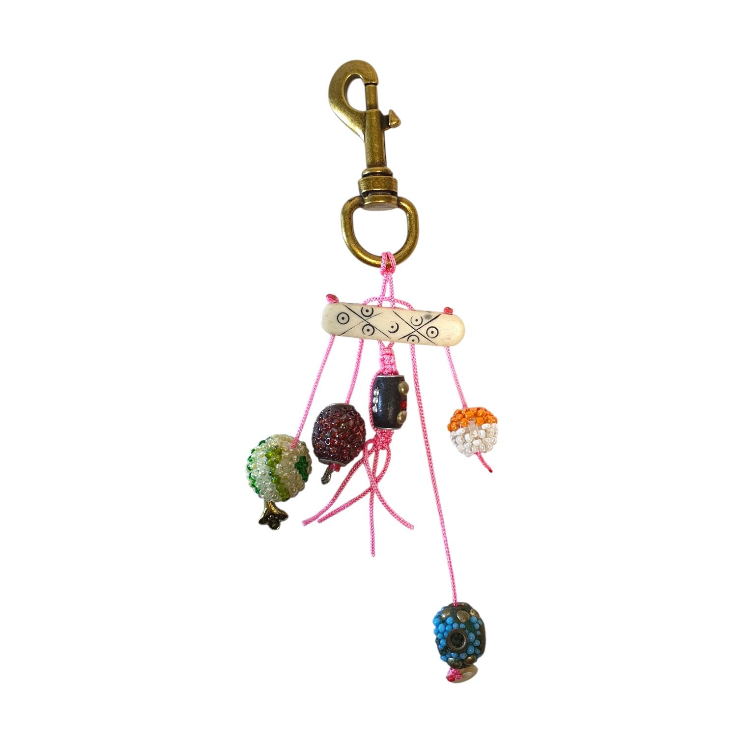 Solid brass hook with antique finish. Hand-strung precious stone beads and artisan-crafted elements as embellishments. Strung with a cord that is High-quality woven nylon thread in signature pink. Premium swivel brass clasp for easy clip-on use. Hand-assembled and hand-knotted.