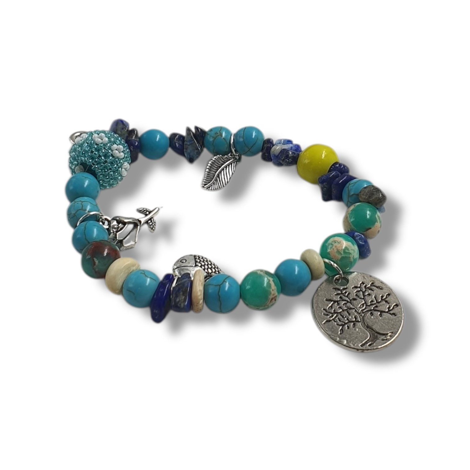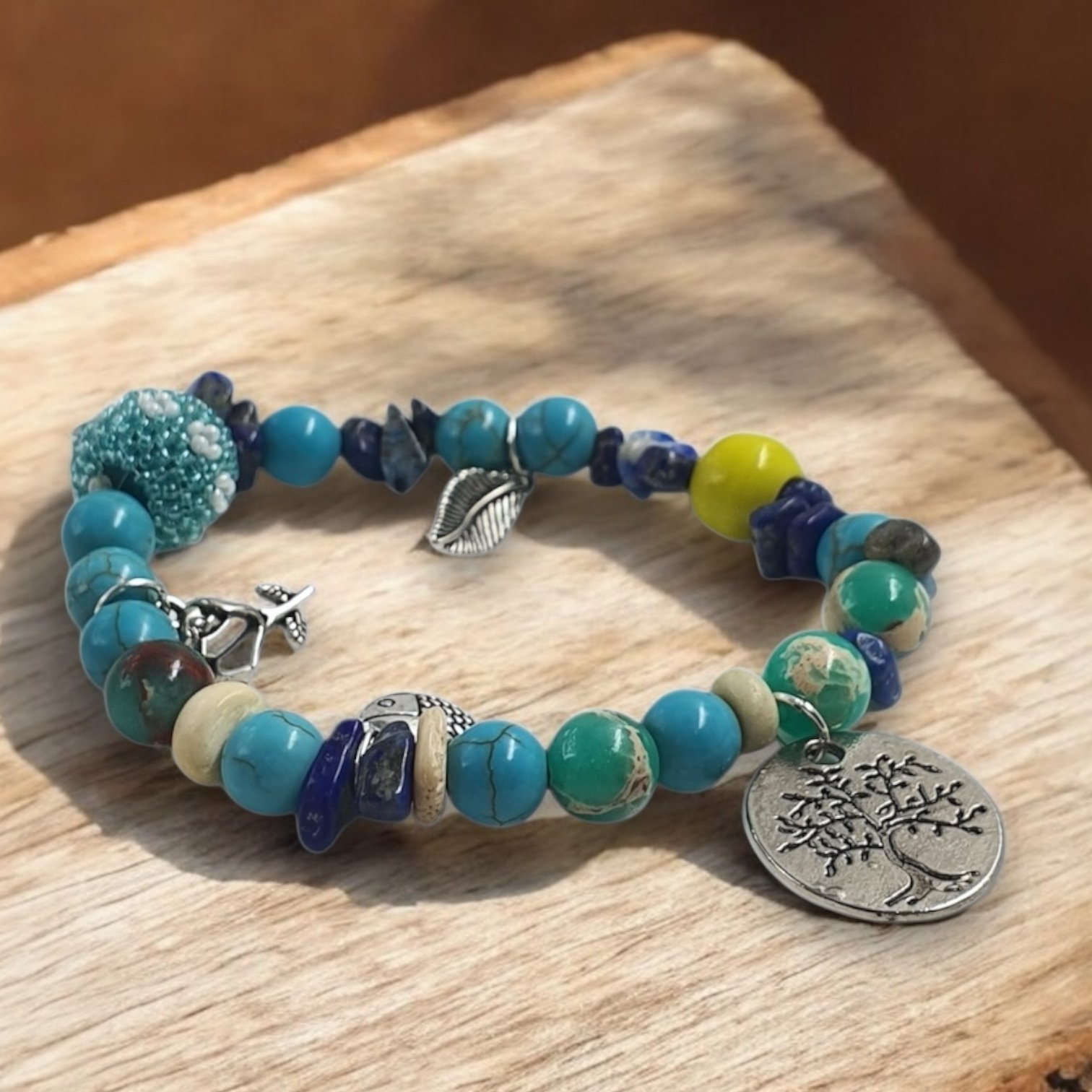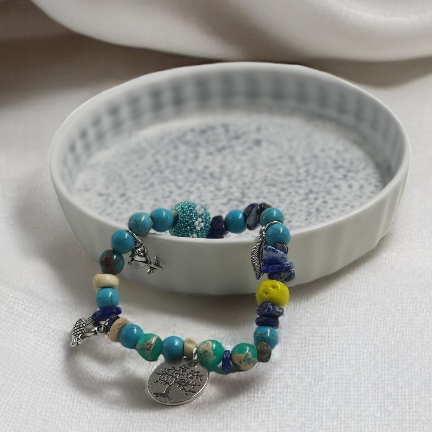 A bold turquoise beaded bracelet with eclectic charms celebrating freedom, healing, and self-expression. Inspired by desert skies and open hearts, this piece is a wearable reminder that your life is your loudest, brightest gift.