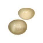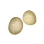 Set of two handcrafted ceramic serving bowls in pale ivory white, featuring visible glaze strokes and a couplet, double-sided shape for easy passing, plating, and everyday family-style serving.