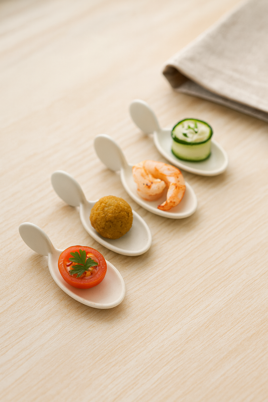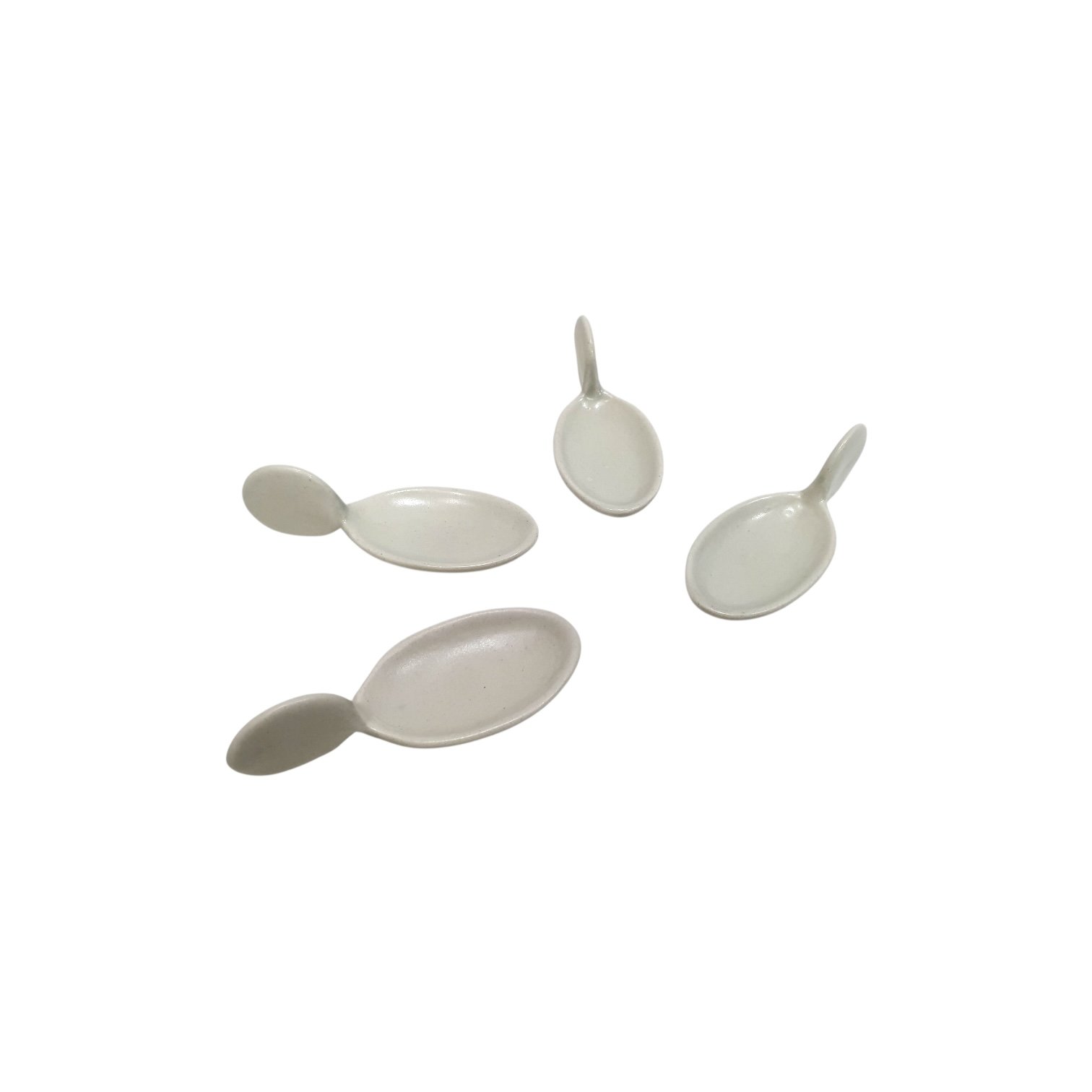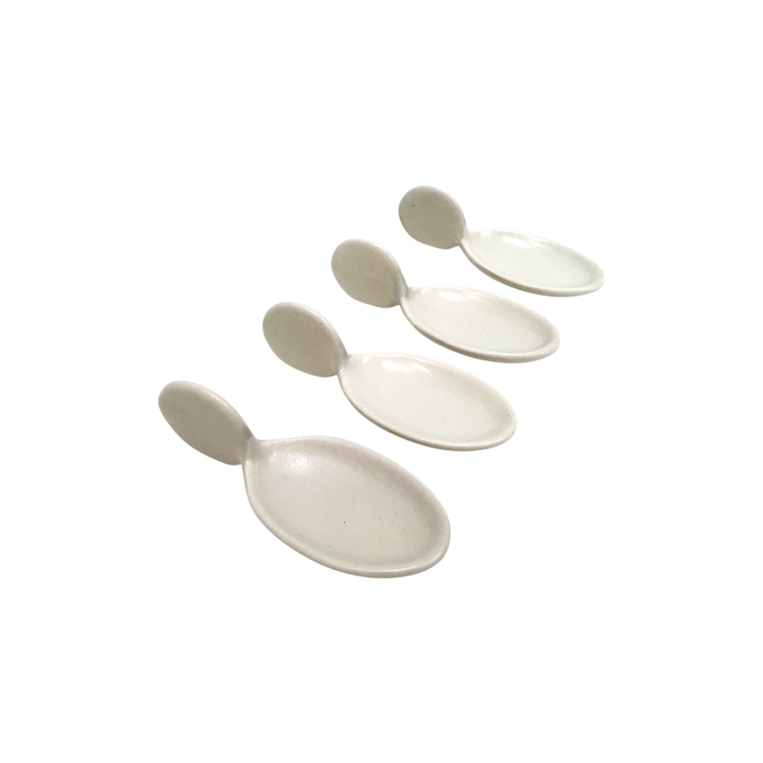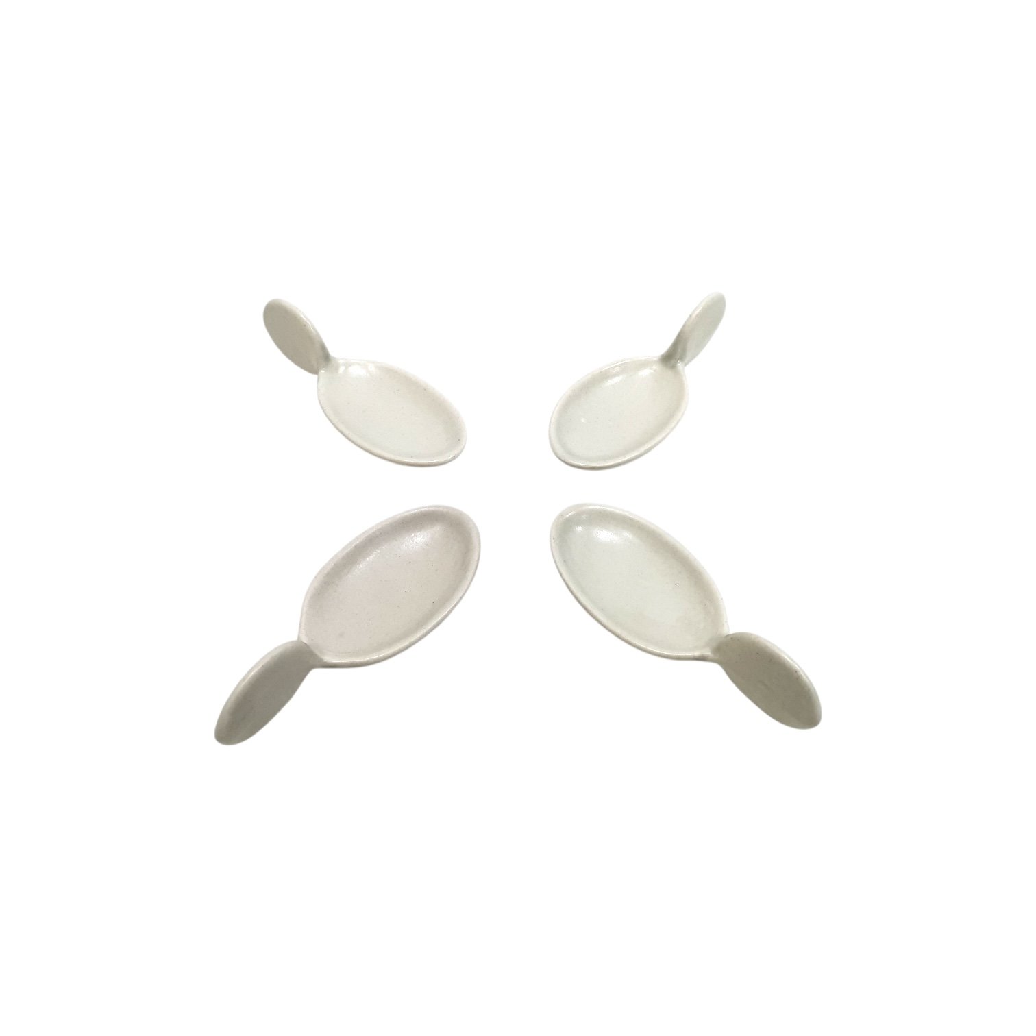 A 4-piece set of off-white glazed fin-handled mini platters. Ideal for single-serve appetizers at home events and modern grazing setups.