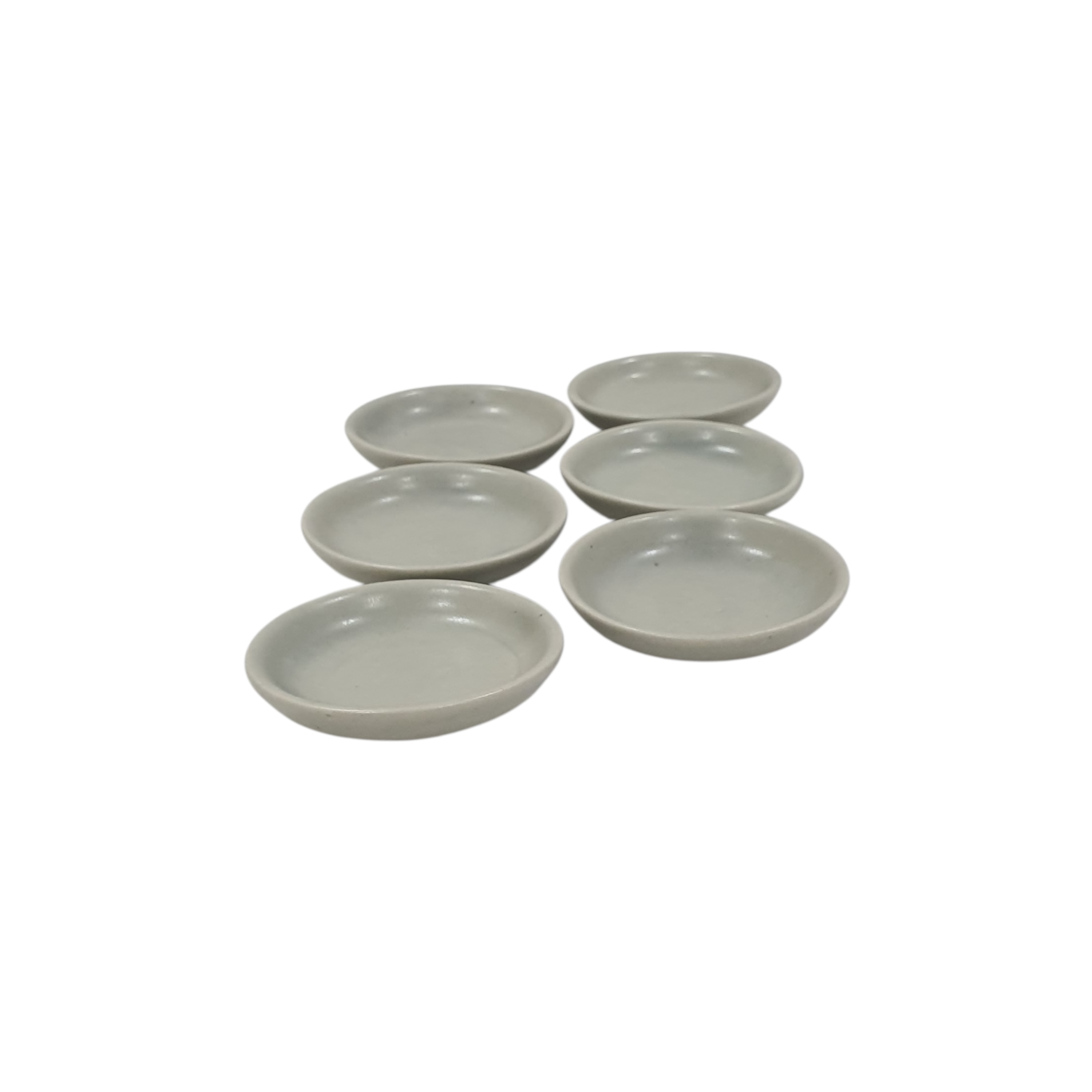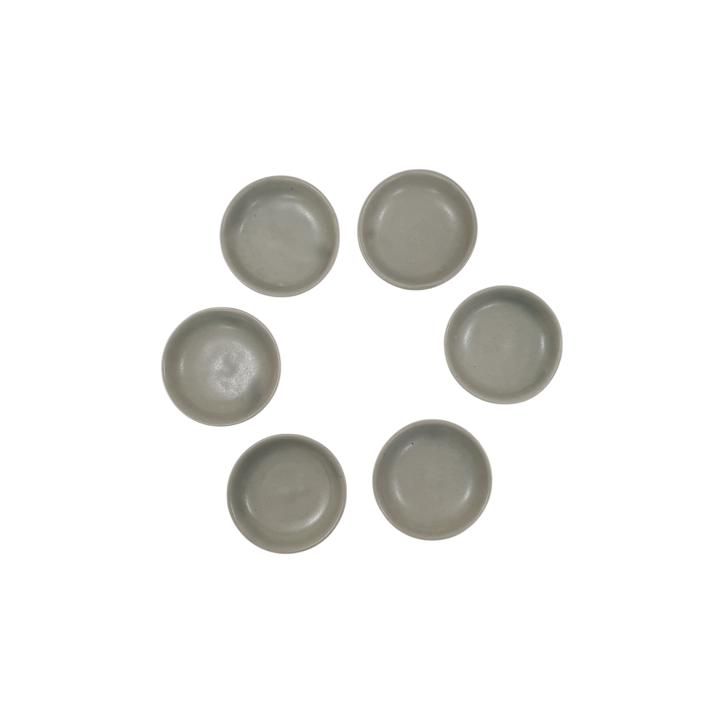 A 6-piece set of off-white, naturally glazed tasting dishes. Designed for single servings, perfect for modern hosting and grazing table presentations.