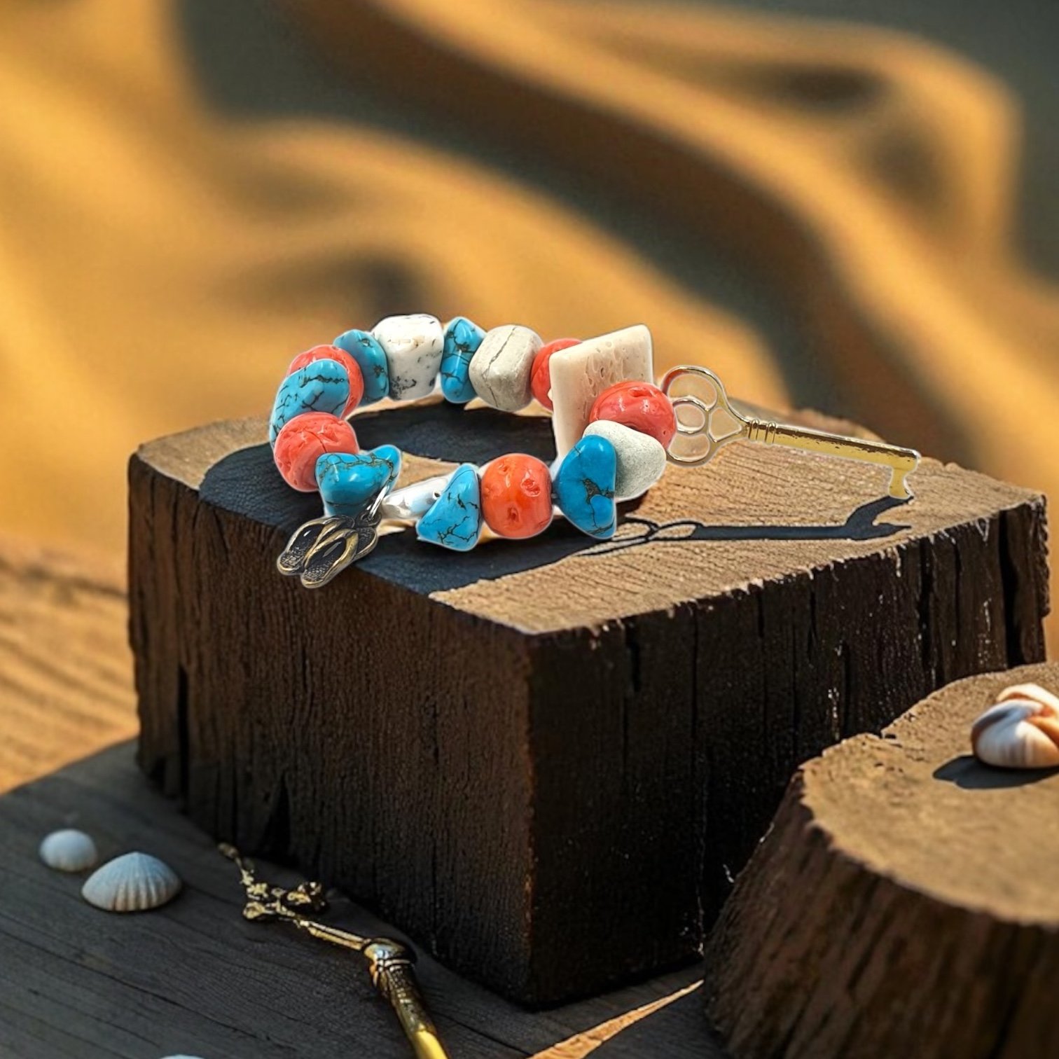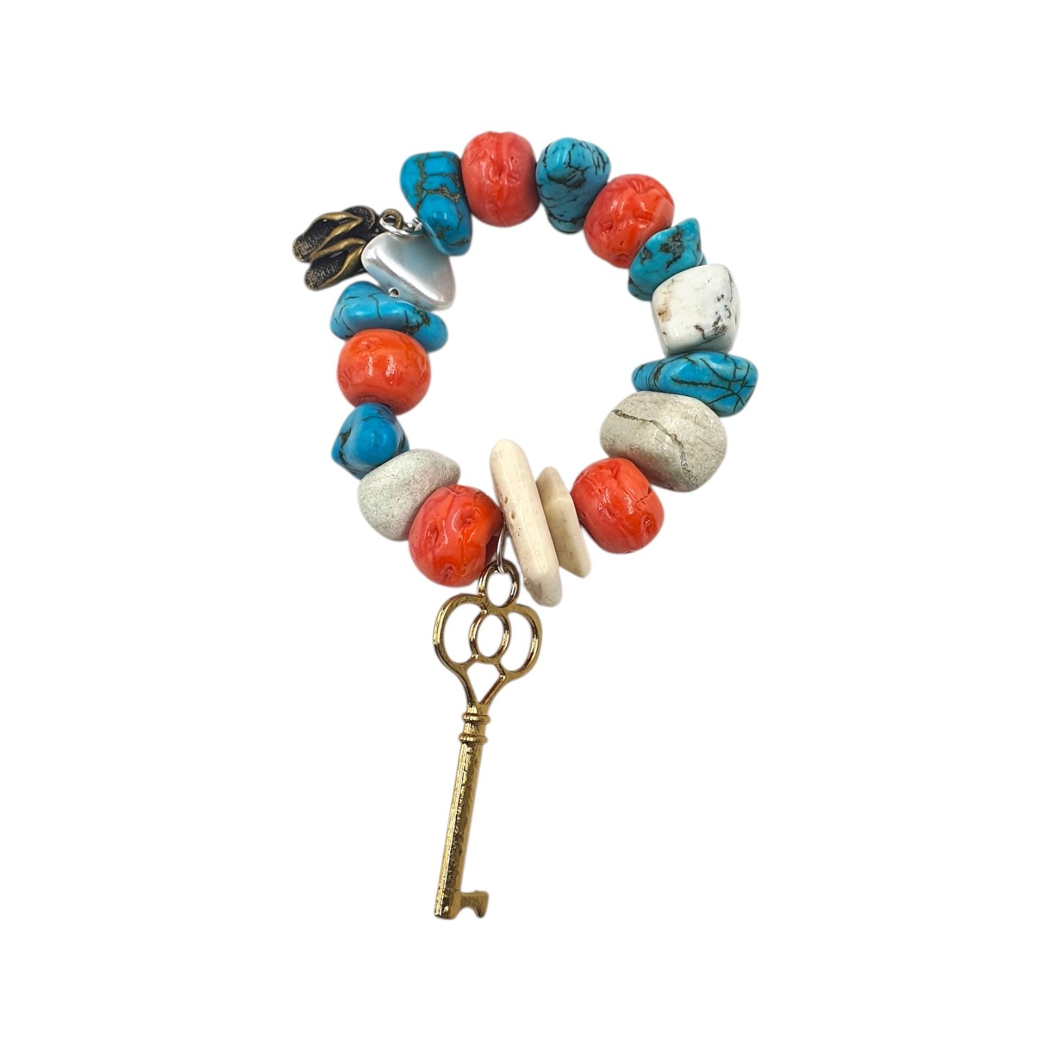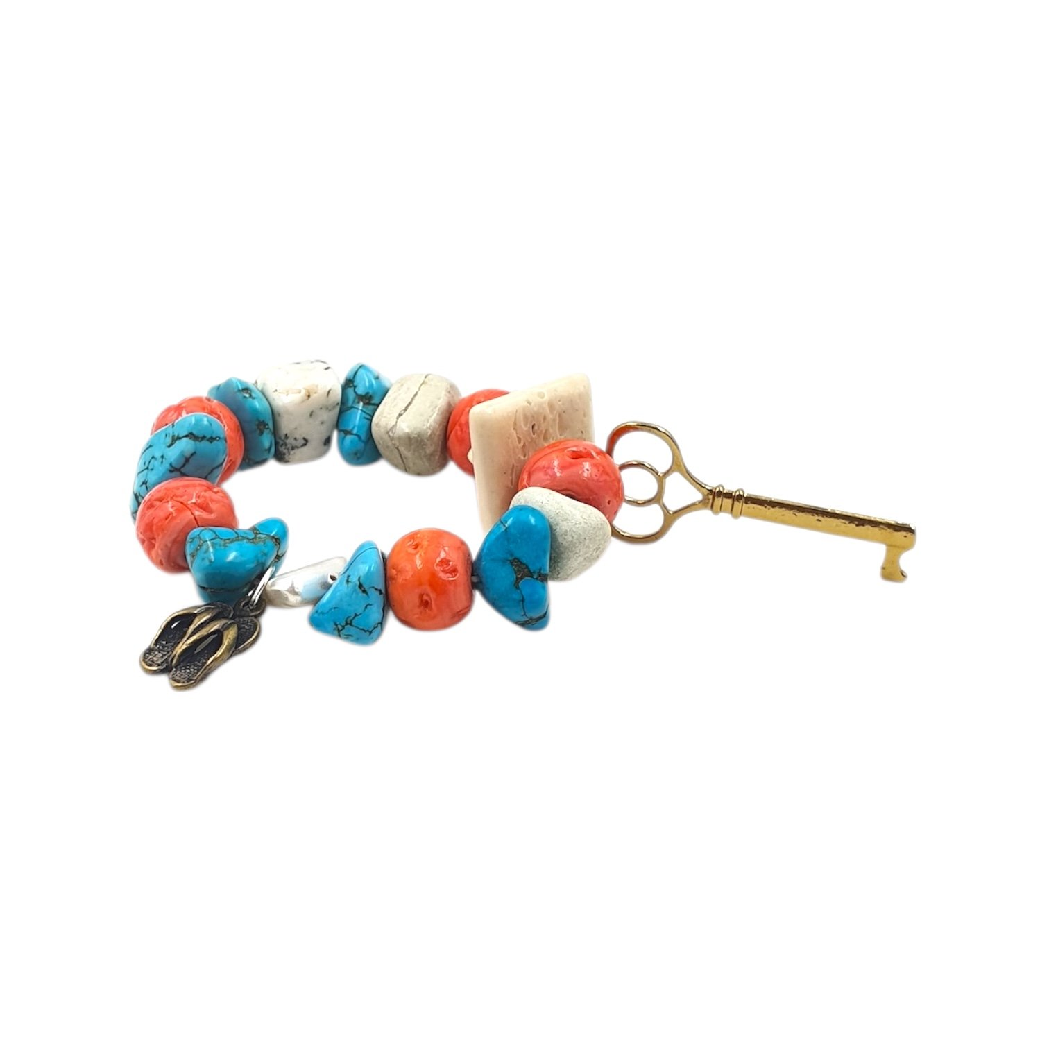 Blue turquoise beads with a long brass key charm. Playful yet mysterious, this bracelet celebrates unlocking adventures, embracing change, and carrying secrets with effortless boho flair.