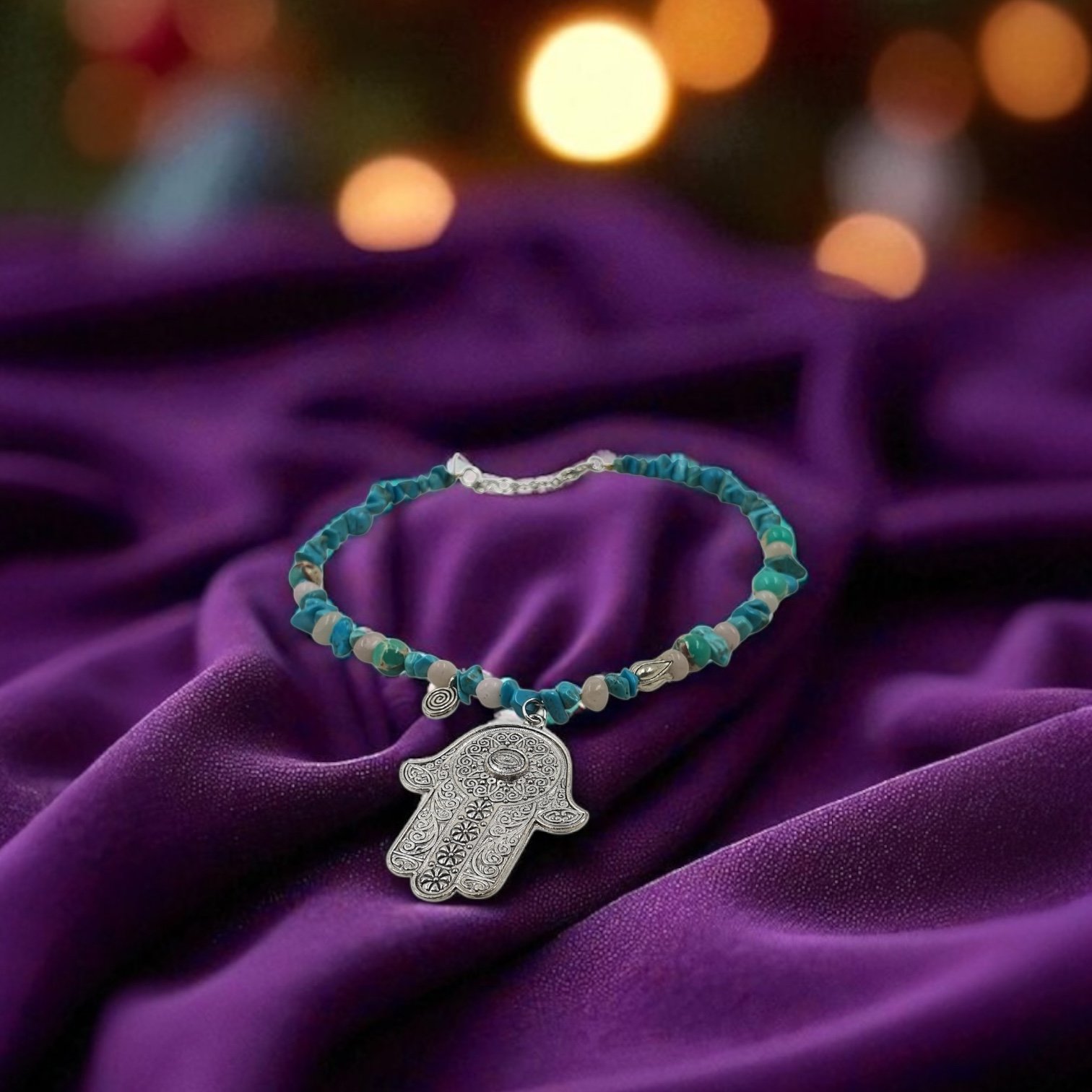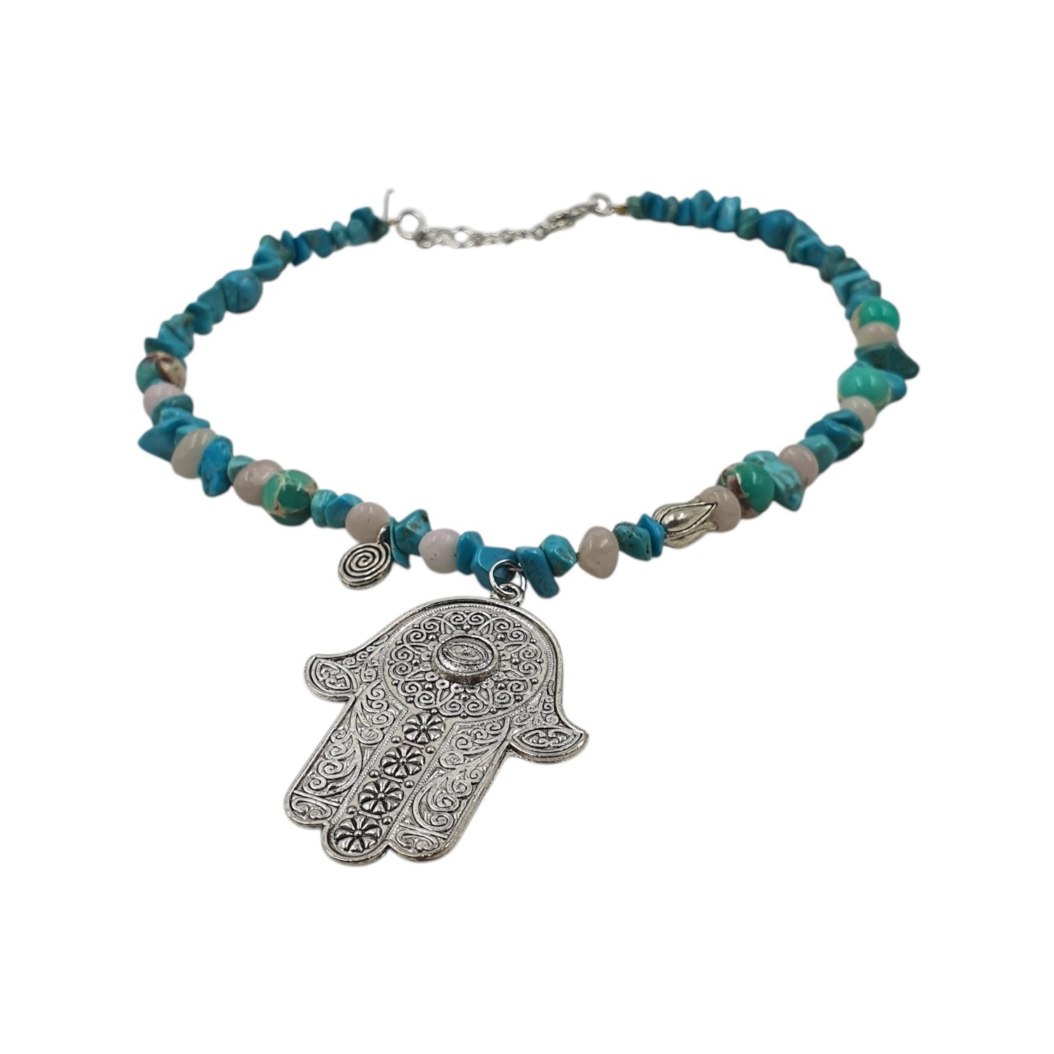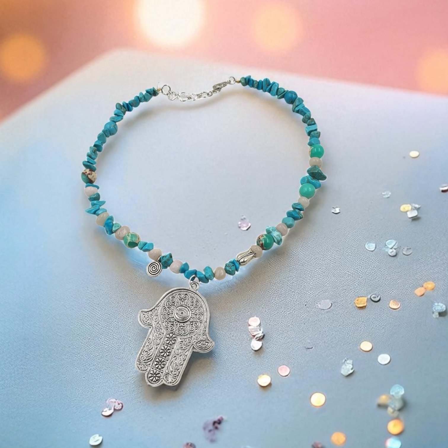 Turquoise beads with a large silver Hamsa and lotus charm. Protective, renewing, and bold—this statement necklace symbolizes strength, balance, and peace in every detail.