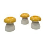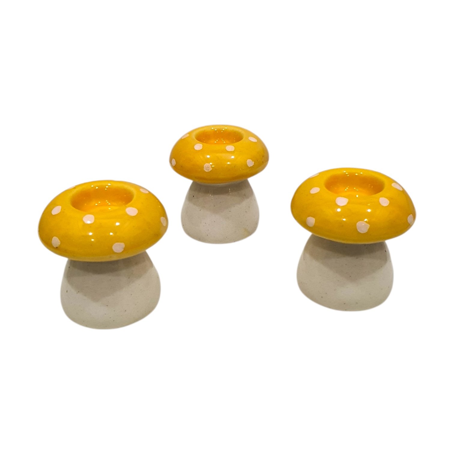 Leafbud Mushroom Glow Holders are a set of three handcrafted ceramic candle stands, featuring yellow dotted caps and sturdy bases, designed to hold taper or pillar candles for charming, seasonal centrepieces.