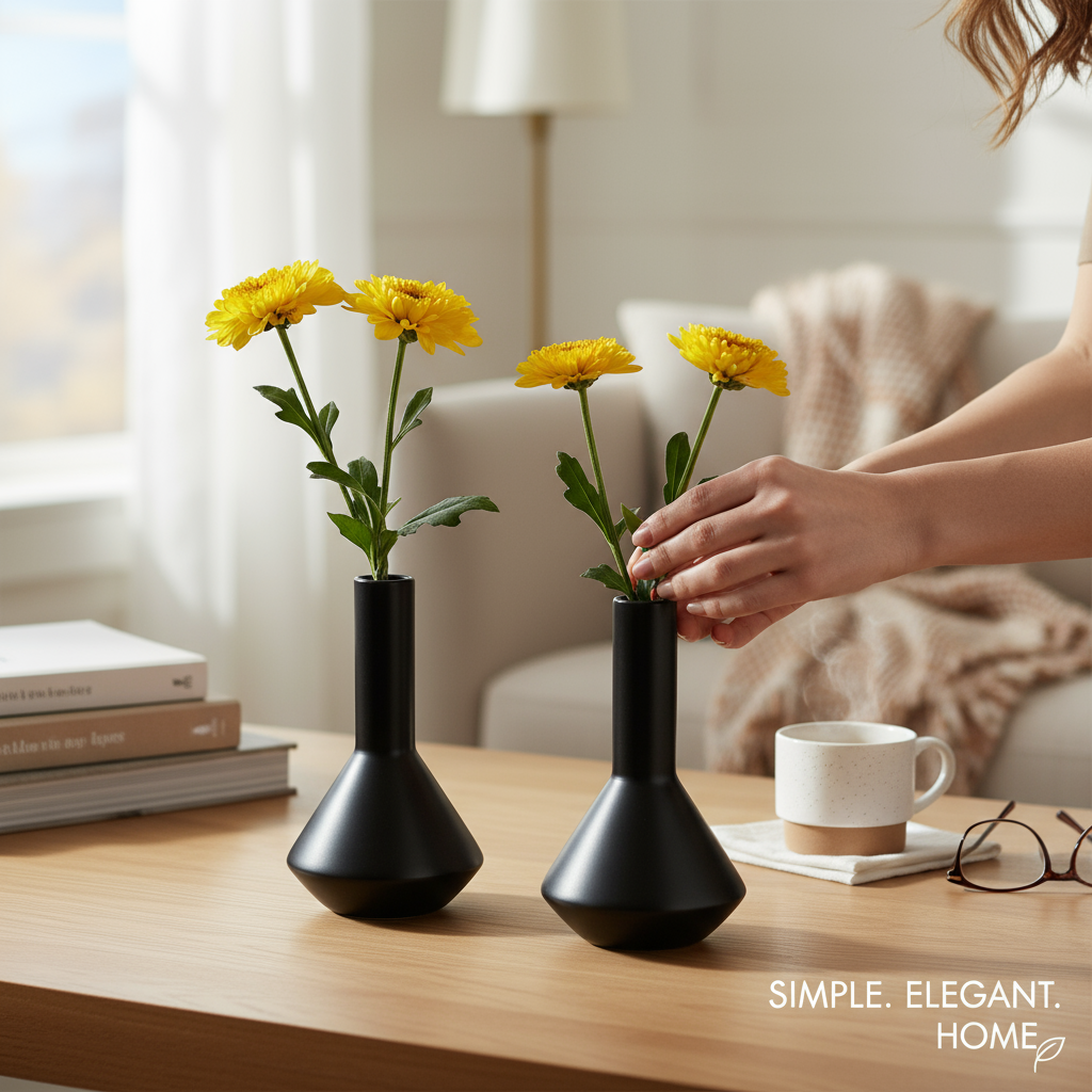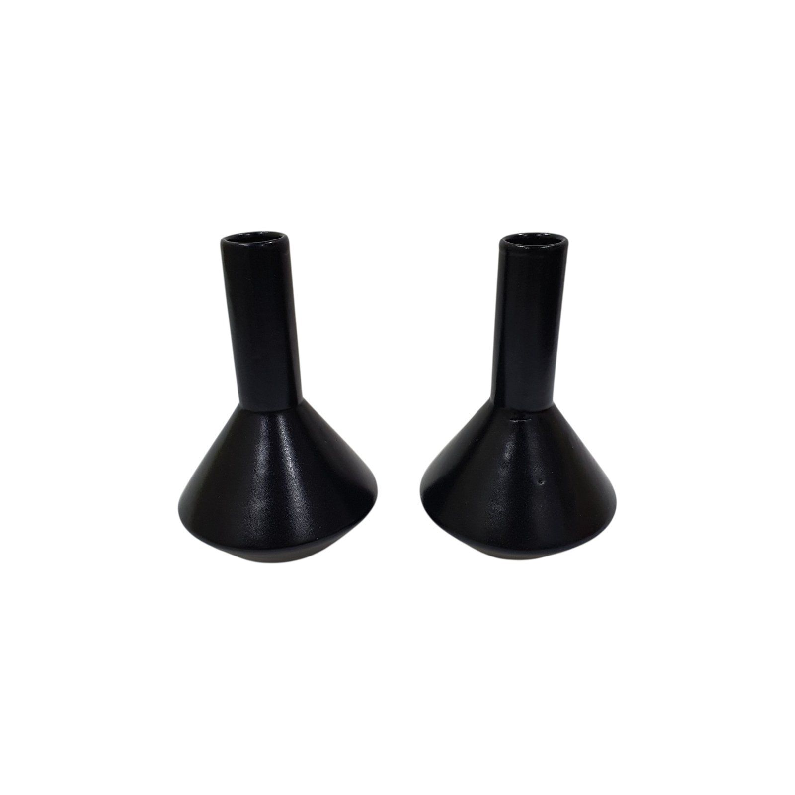 Set of two matt black vases with unique wide bases, exclusively designed by Leafbud. Durable ceramic construction, ideal for creative floral displays or elegant standalone accents.