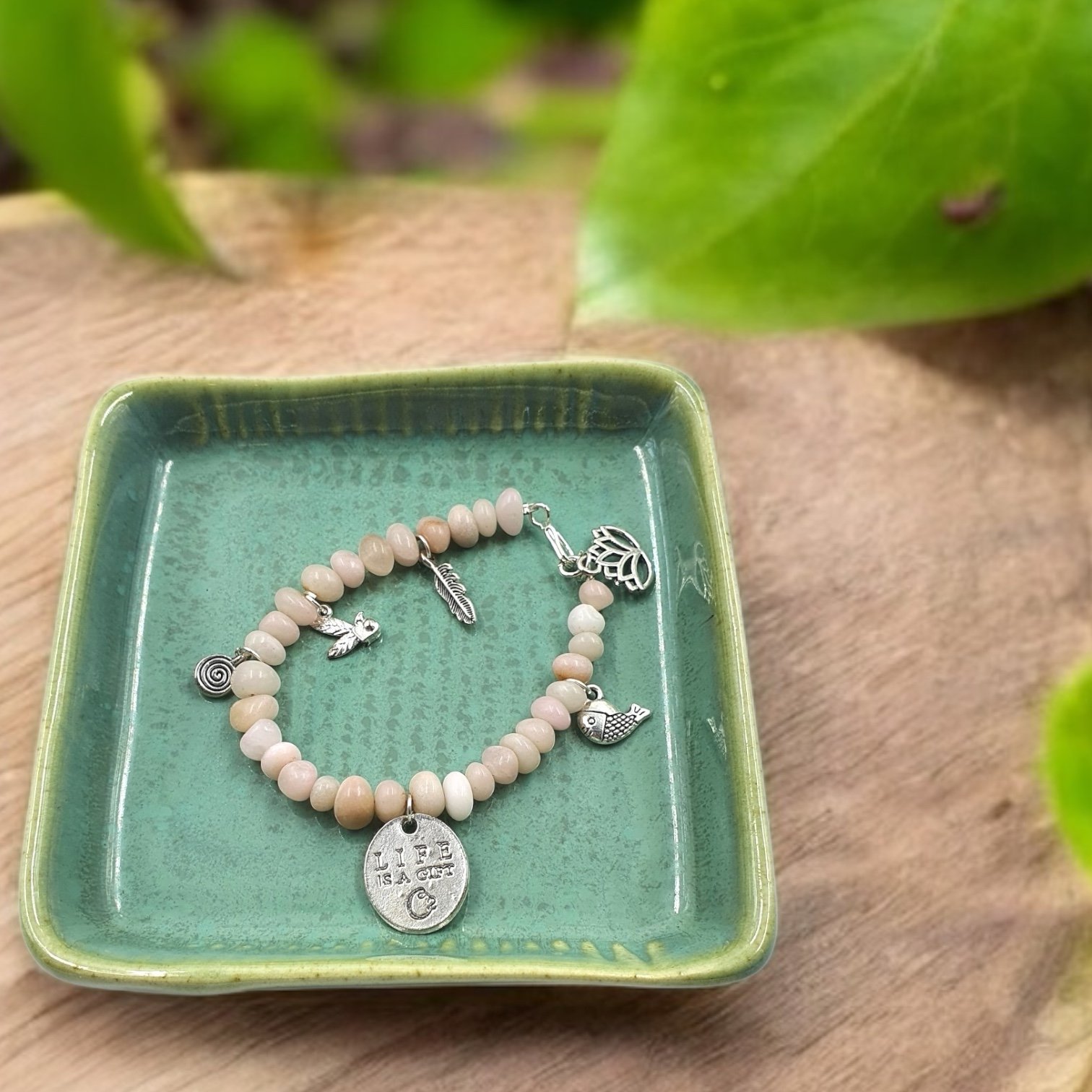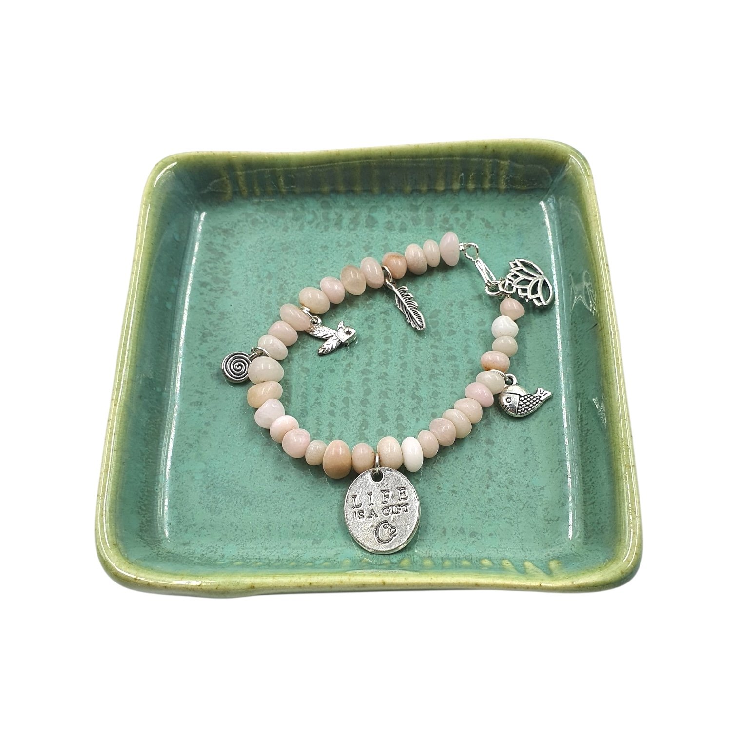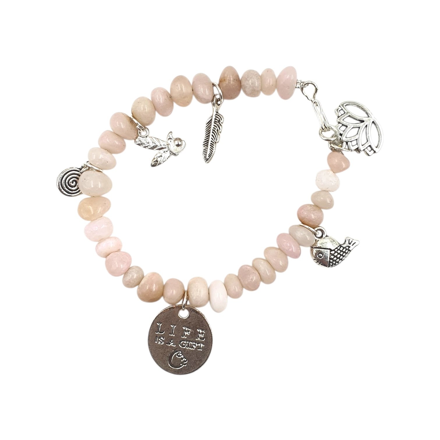 Pink opal beads adorned with lively charms celebrate the “gift of life.” Playful, radiant, and feminine, this bracelet speaks of new beginnings and unapologetic joy—crafted for Gen Z souls who shine without hesitation.