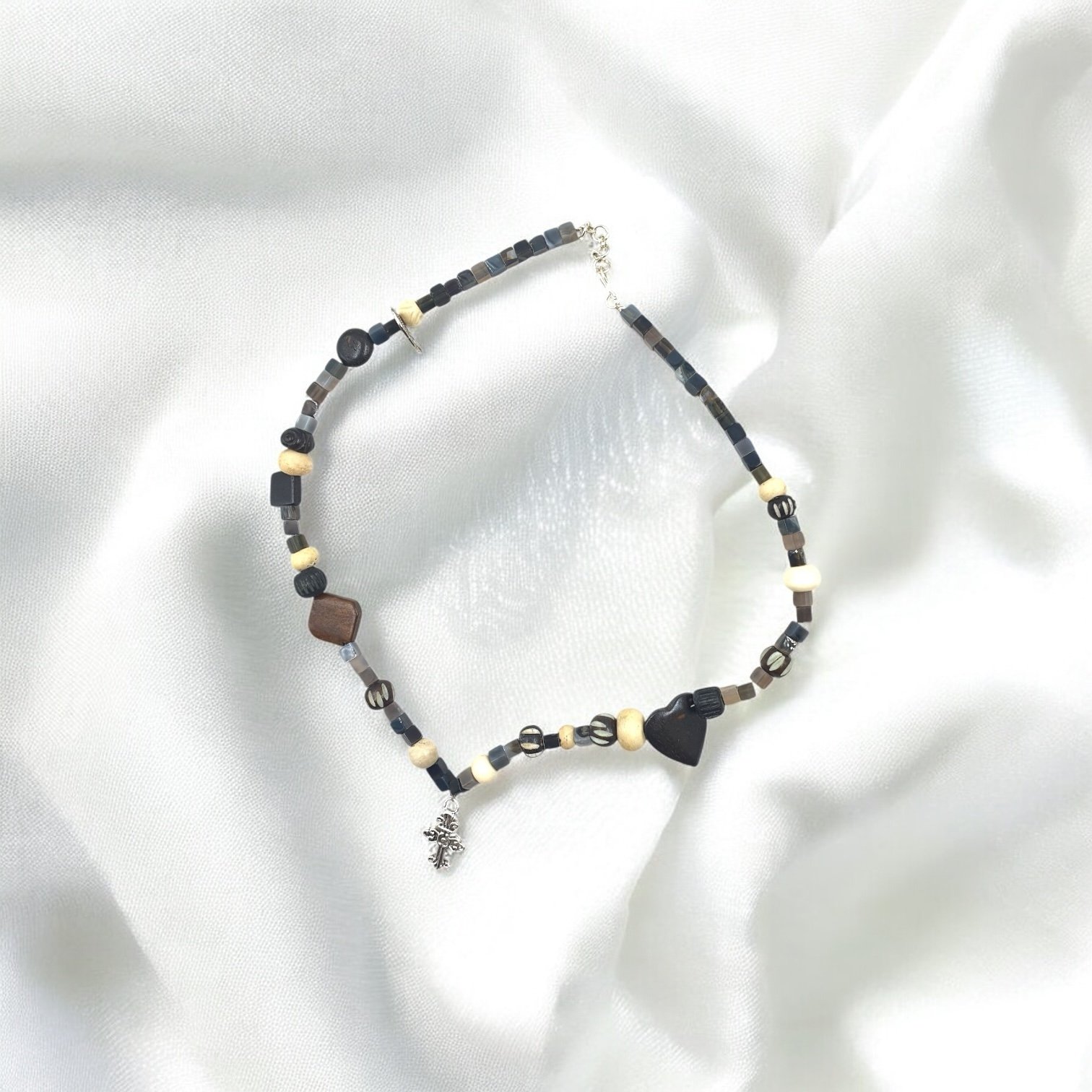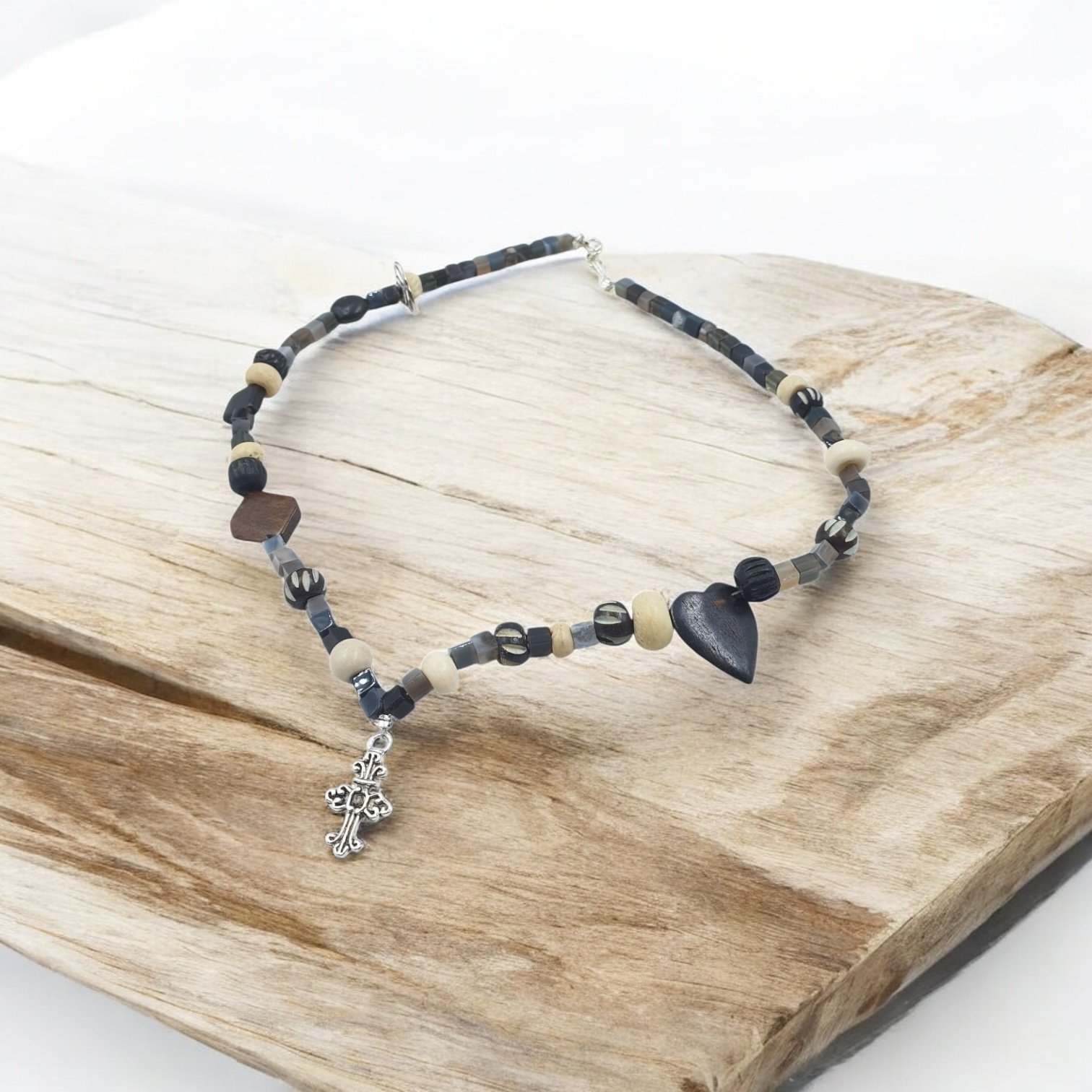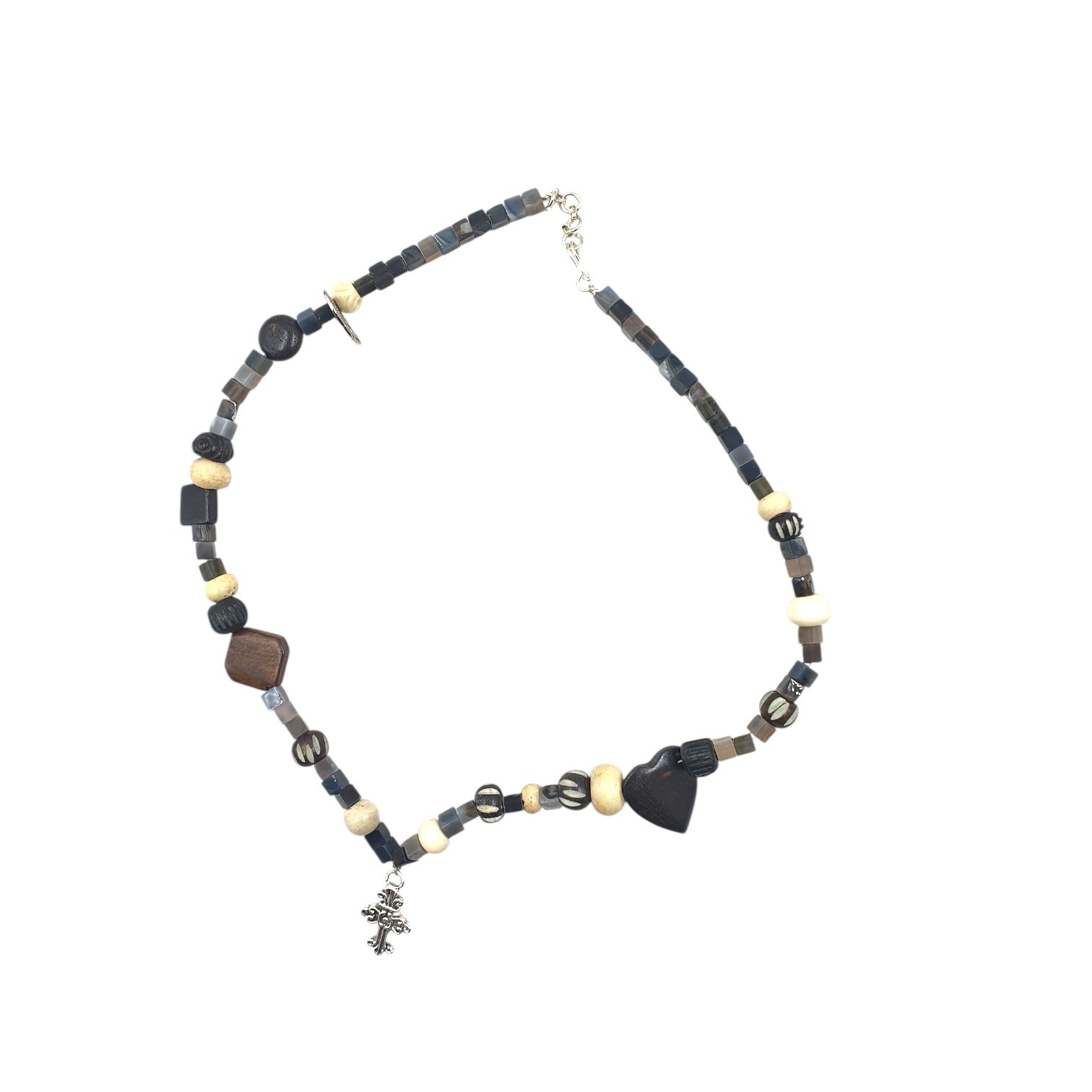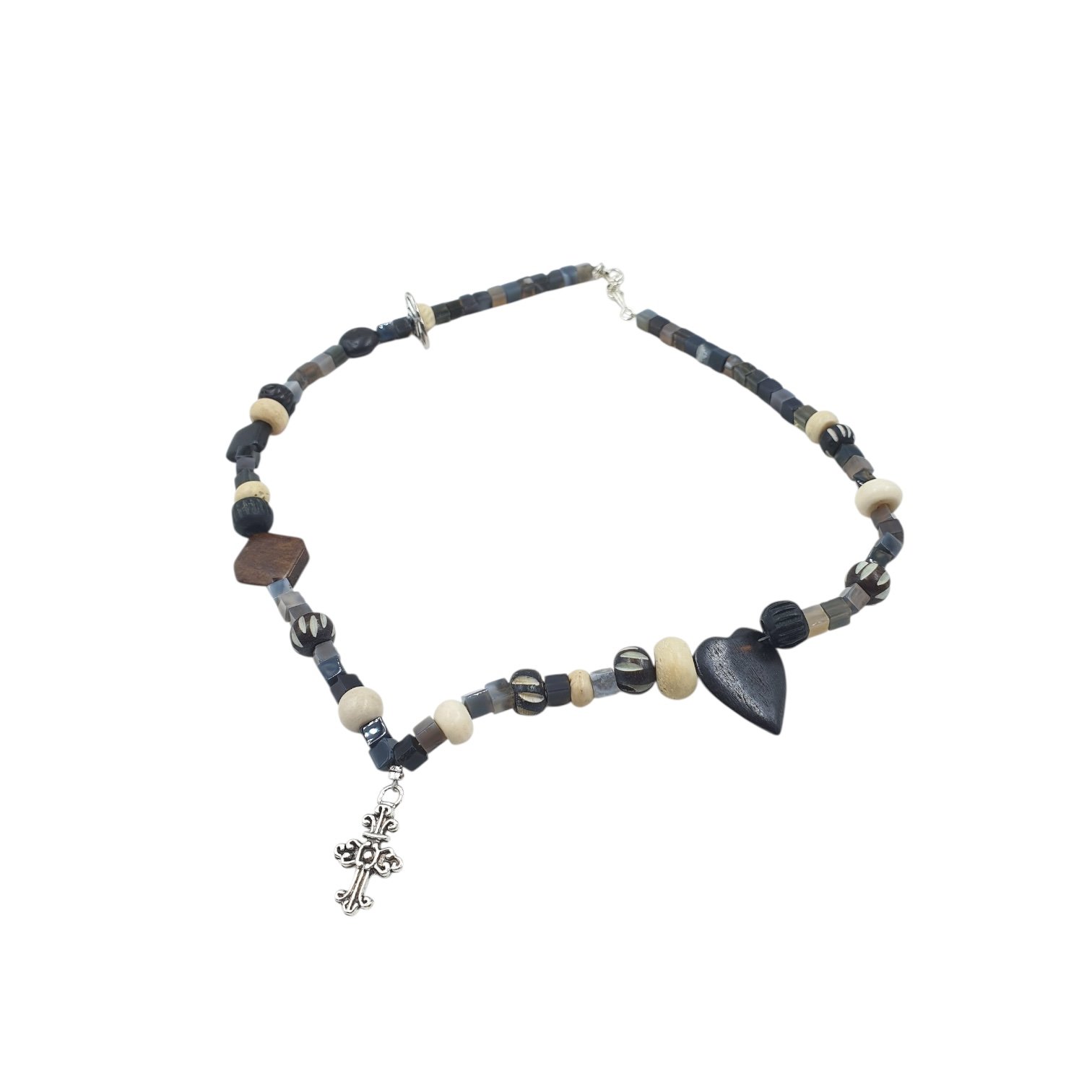 A natural Sulemani Hakik stone necklace anchored with a brass cross. Grounding, protective, and full of gothic charm, this statement piece carries depth and mystery for those who like their jewellery powerful and symbolic.