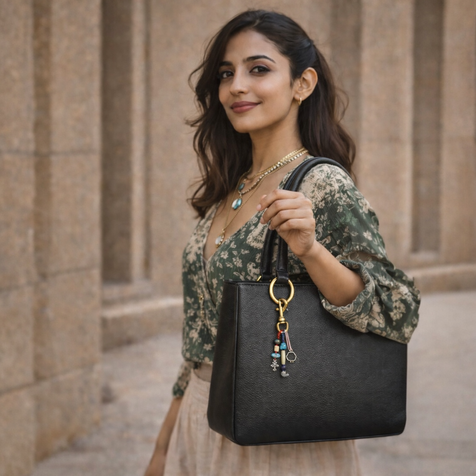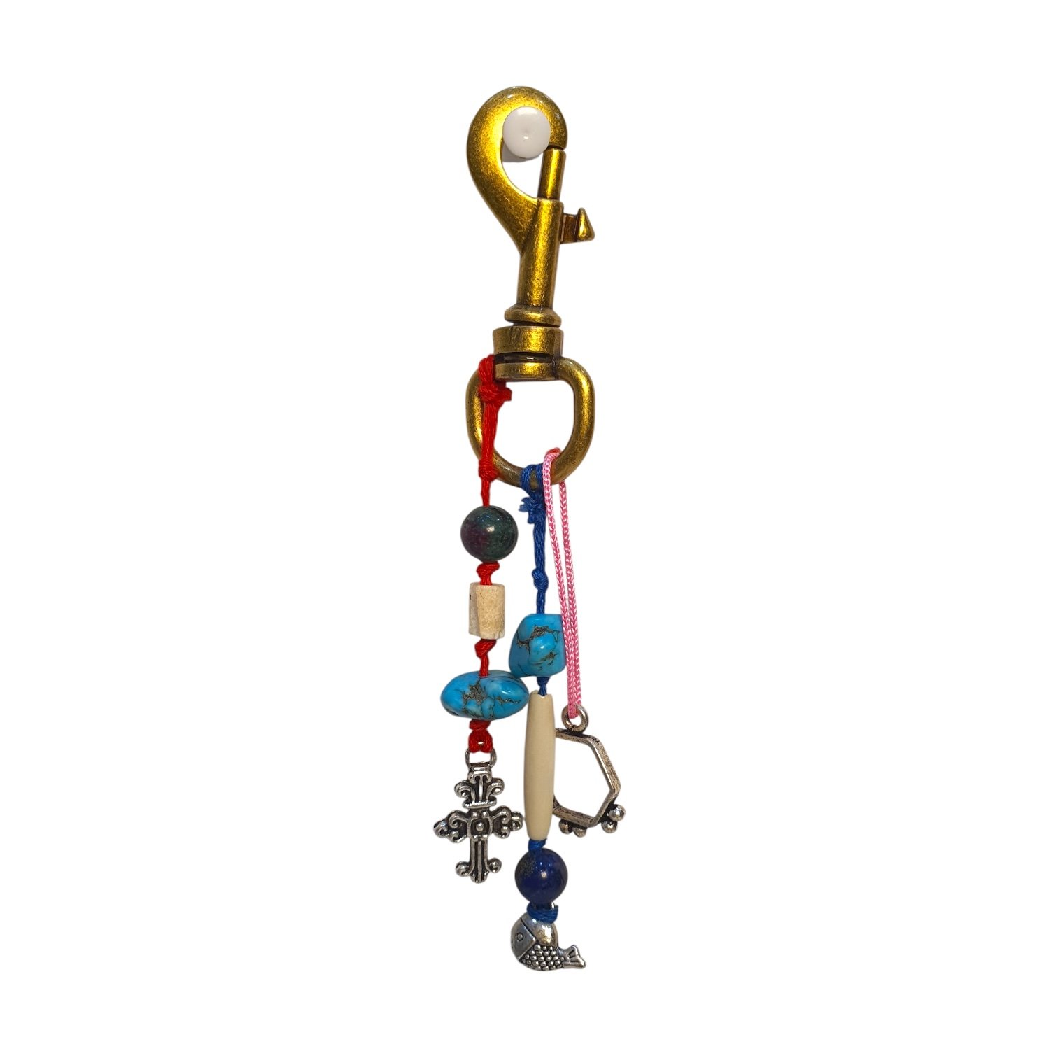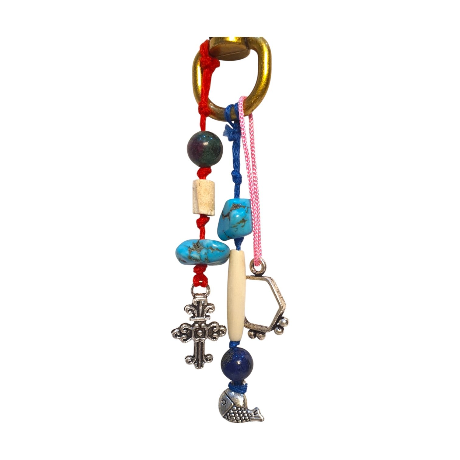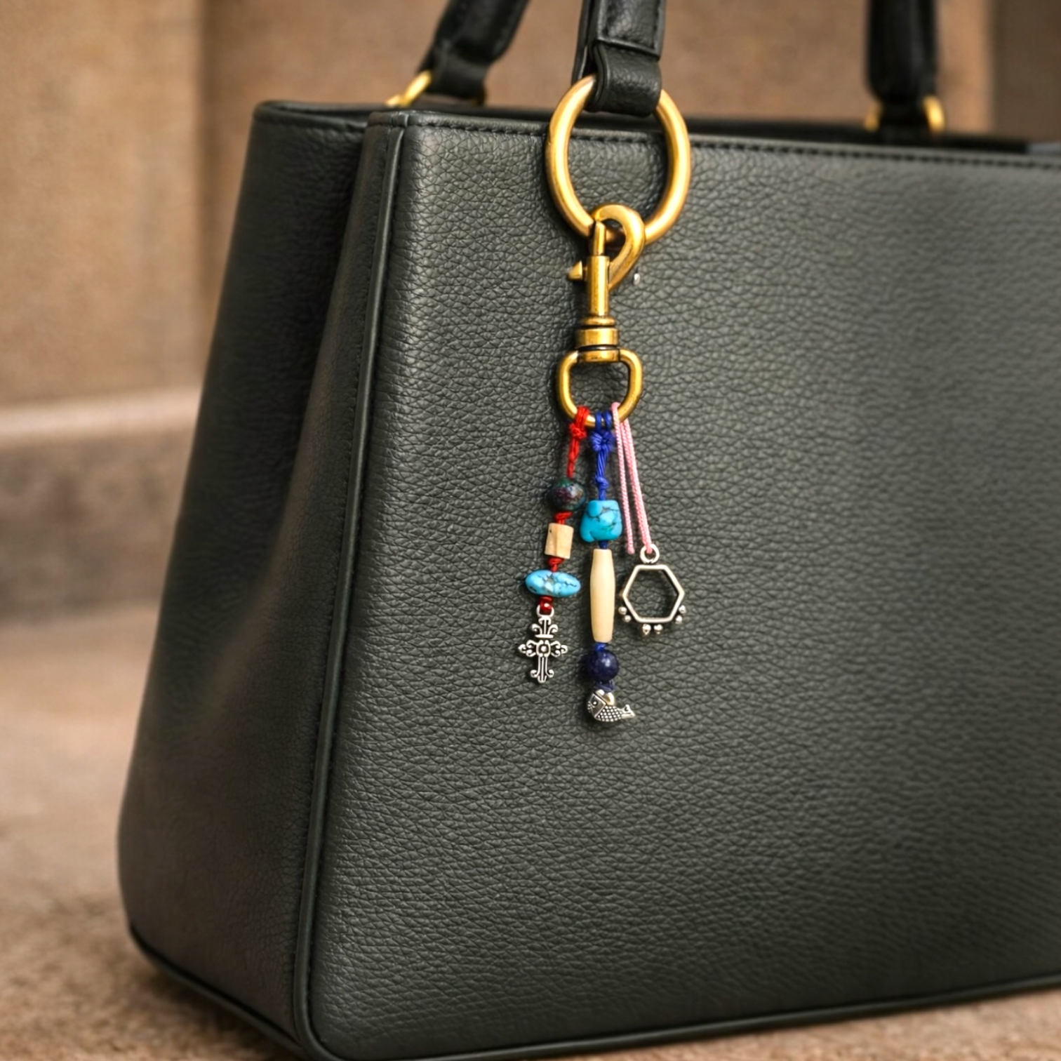 Leafbud Turquoise Talisman Charm is a handcrafted composition of precious turquoise stones, natural beads and symbolic metal elements set in brass, designed to bring character, colour and quiet strength to your everyday bag while reflecting a free-spirited, artistic sensibility that feels both rooted and contemporary.