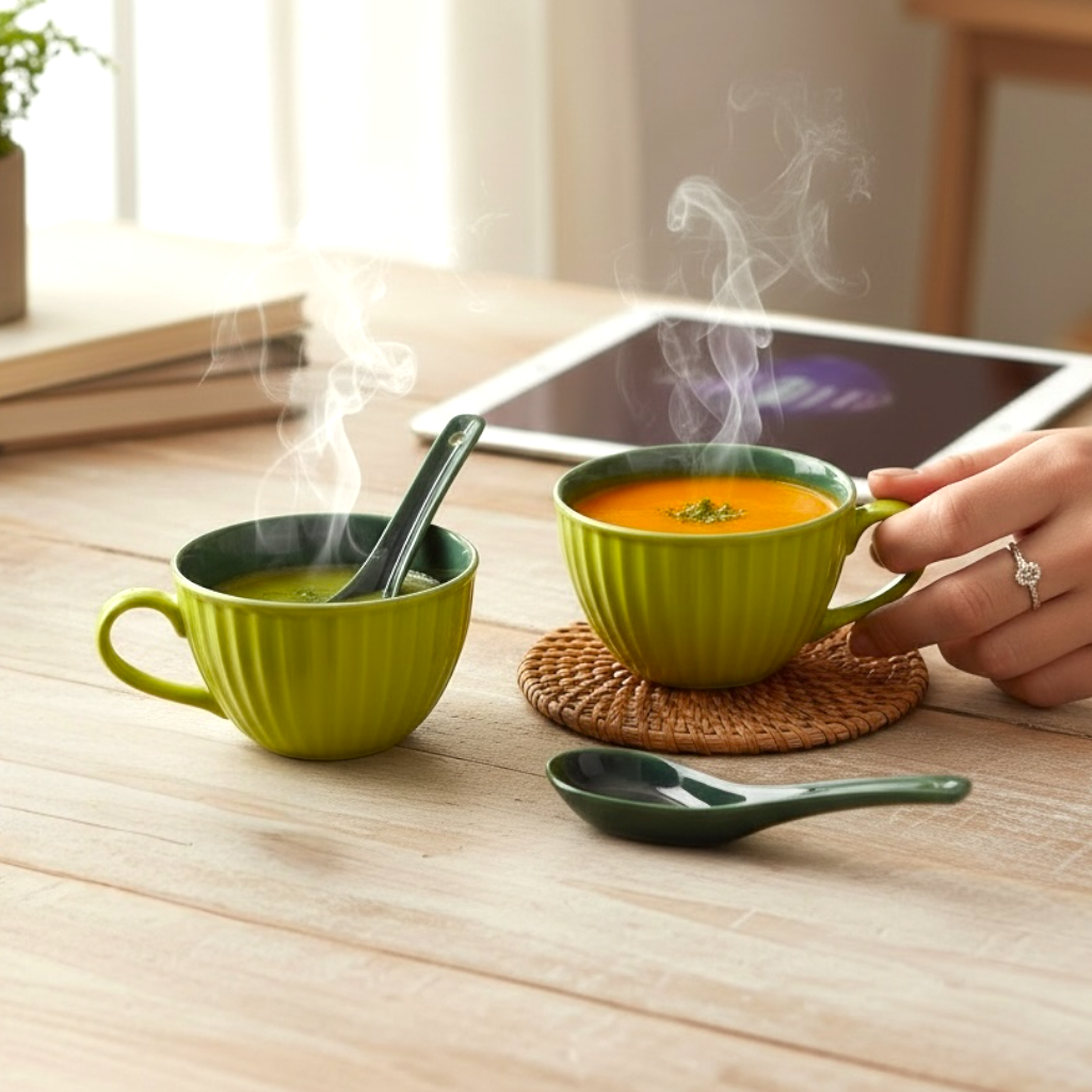 The Leafbud Verdant Soup Duo includes two handcrafted ceramic soup mugs with matching soup spoons. Each mug features an easy-to-hold ribbed surface design, promoting grip and elegant visual appeal. The unique glaze showcases a vibrant fluorescent green exterior and a rich jungle green interior, with spoons colored to match the inside of the mugs. Designed as functional serveware that doubles as table art, this set is ideal for serving hot soups, chowders, broths, or desserts. Every set is individually crafted, so subtle differences in ribbing and glaze enhance the authenticity and uniqueness of each piece.