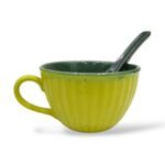The Leafbud Verdant Soup Mug includes handcrafted ceramic soup mug with matching soup spoon. Every mug features an easy-to-hold ribbed surface design, promoting grip and elegant visual appeal. The unique glaze showcases a vibrant fluorescent green exterior and a rich jungle green interior, with spoons colored to match the inside of the mugs. Designed as functional serveware that doubles as table art, this set is ideal for serving hot soups, chowders, broths, or desserts. Every set is individually crafted, so subtle differences in ribbing and glaze enhance the authenticity and uniqueness of each piece.