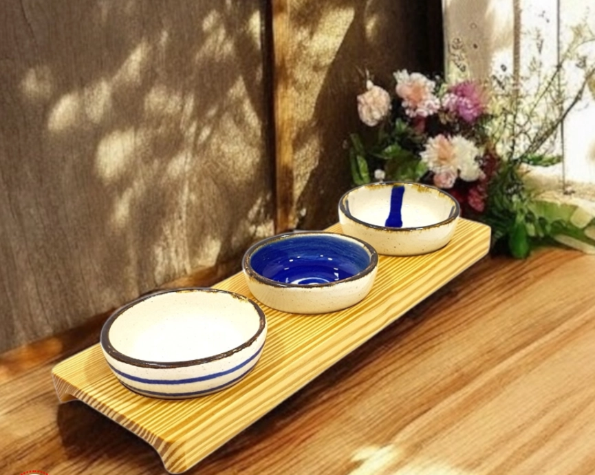 Handcrafted with extra love and care, our Blue Bloom Starter Tray features three artisan bowls resting on a hand-hewn wooden platter. Let your appetizer vessels reveal your love for art and your passion for creating your table space —an inviting, familiar space.